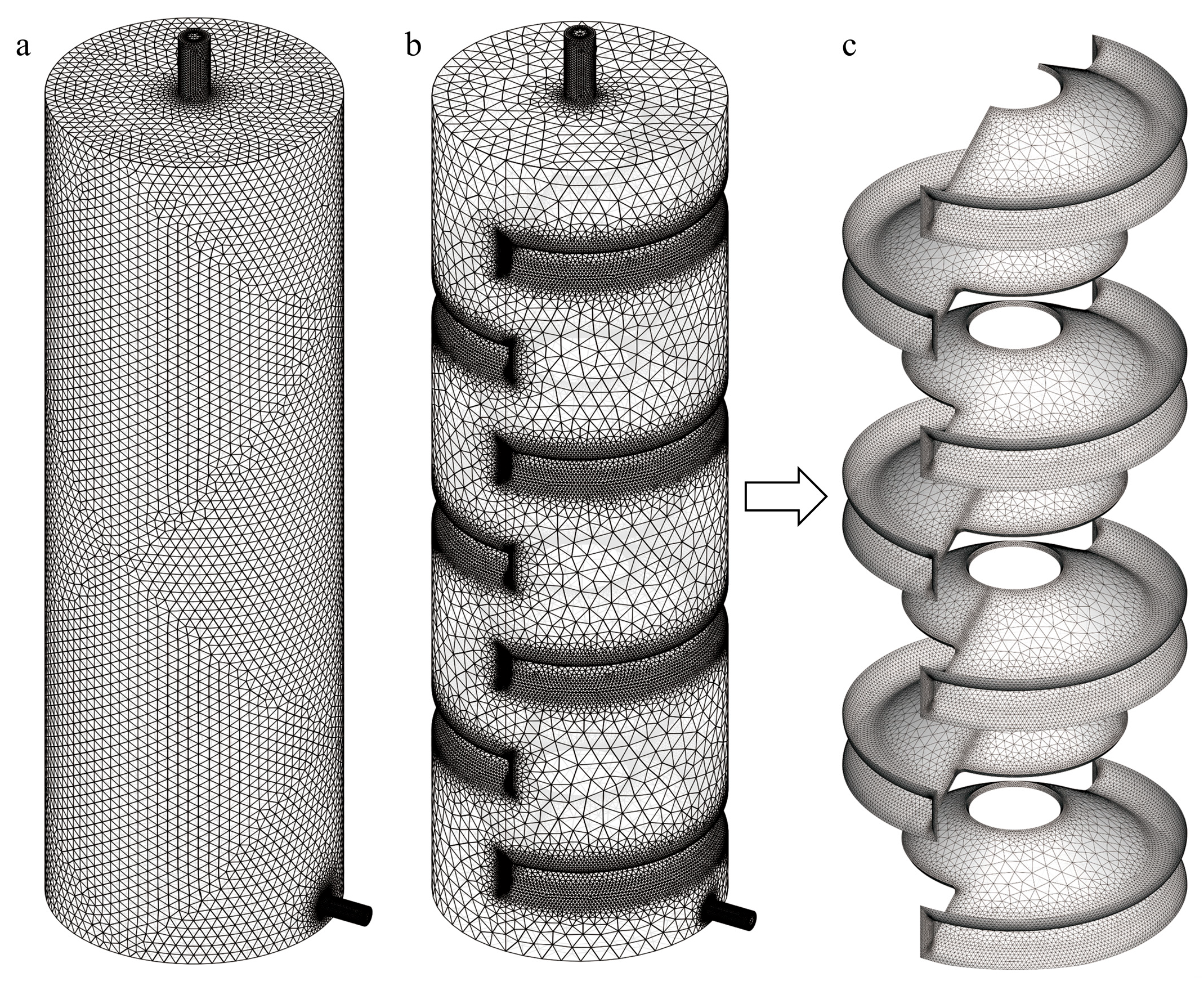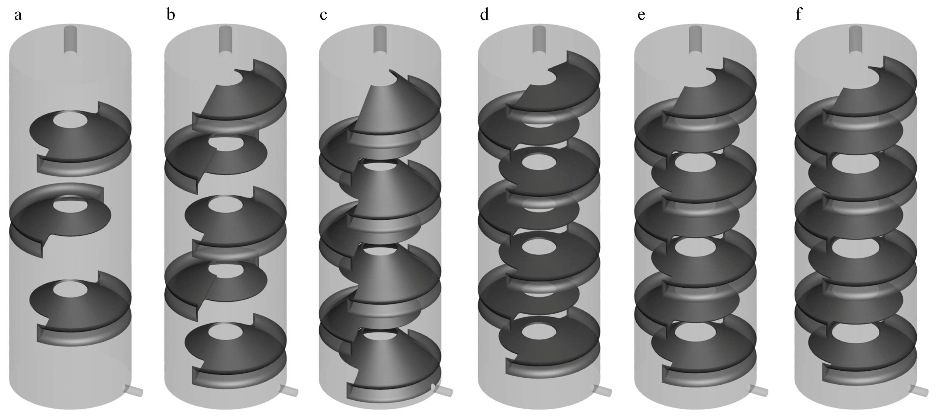 Figure 1f). The first baffle is positioned 34 mm above the bottom wall, with subsequent baffles spaced 30 mm axially and having a thickness of 1.2 mm (