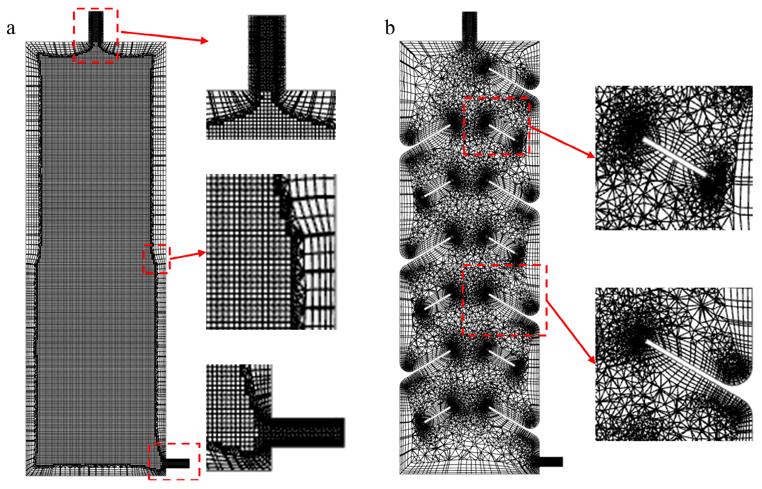 k-ε turbulence model, adequately thick boundary layer meshes were applied to both models. The specific meshing strategy was as follows: first, the flow field velocity was estimated based on the definition of