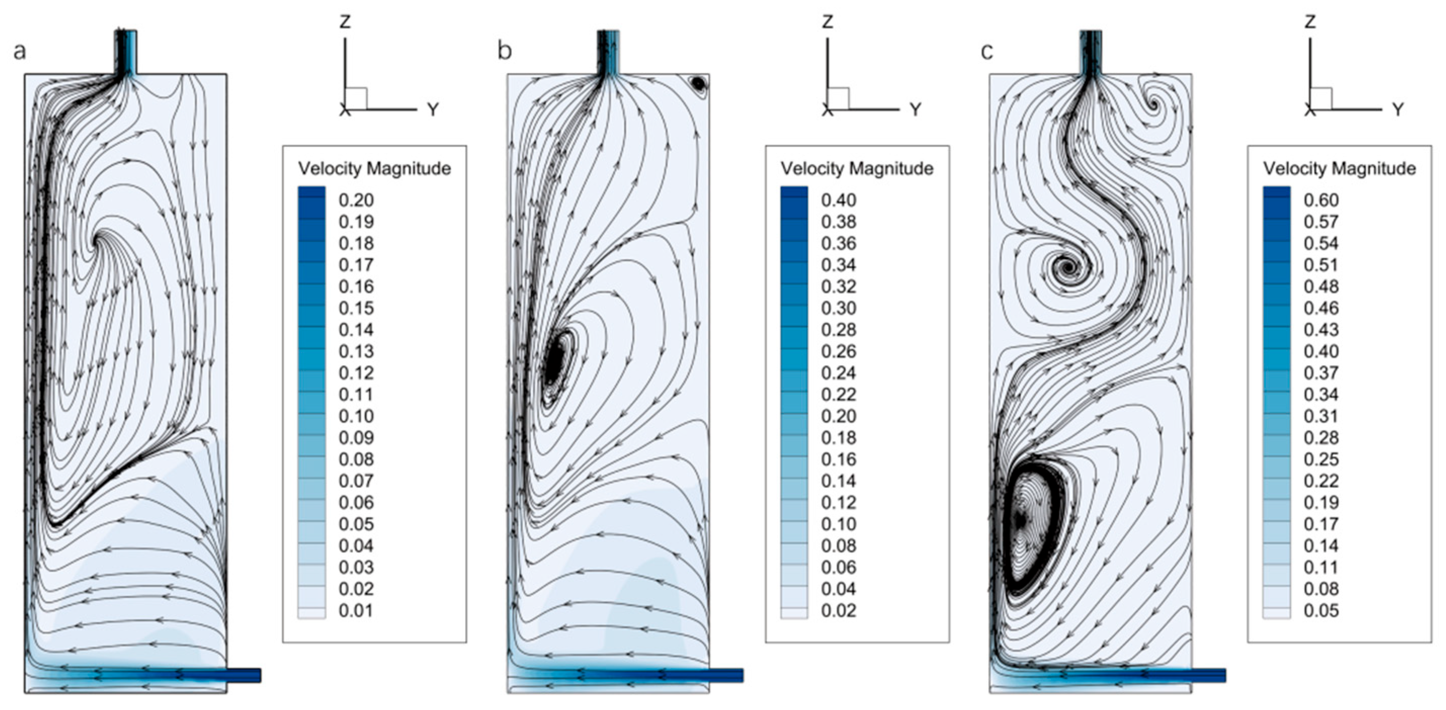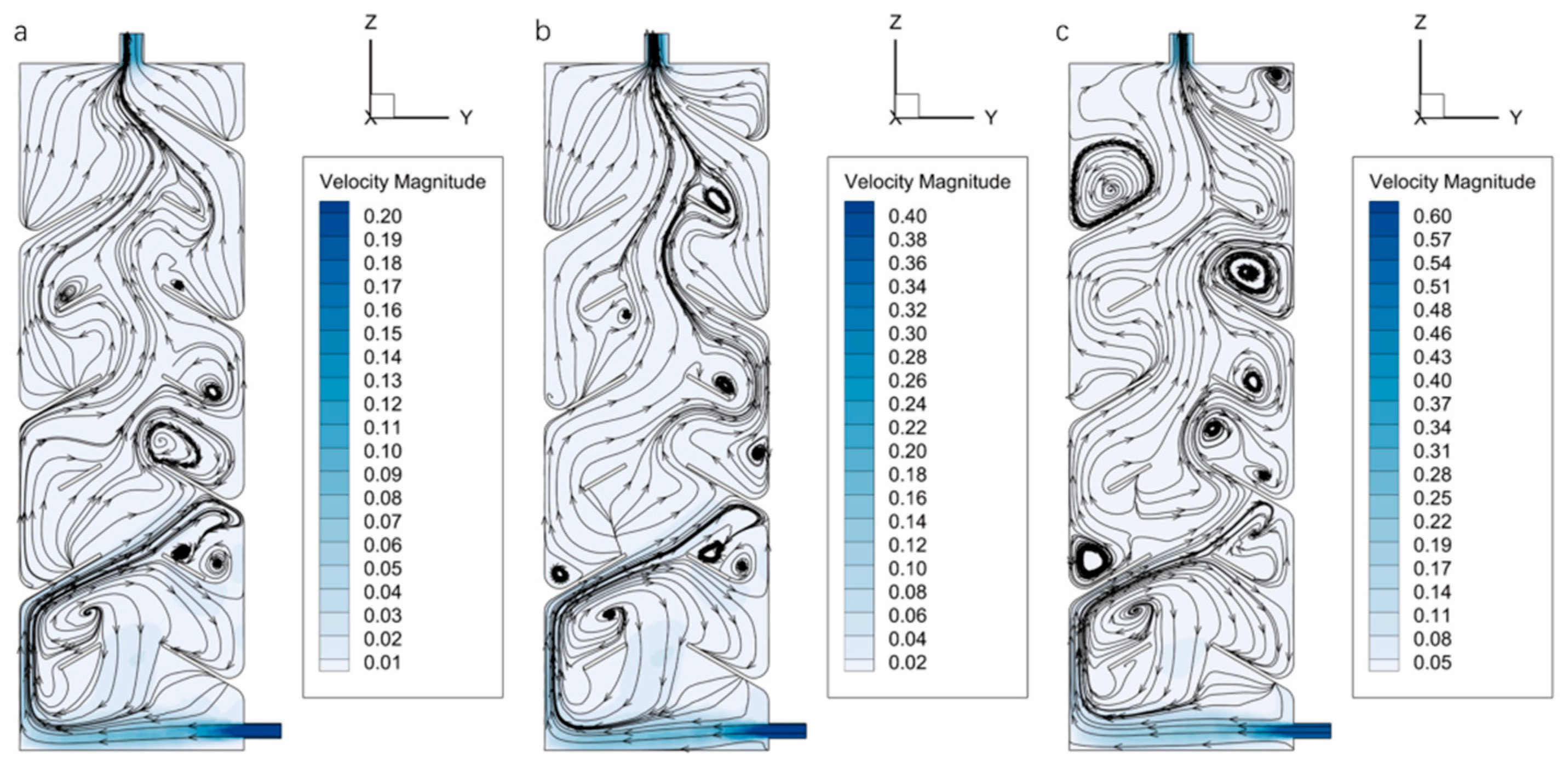 Figure 8a, the streamlines are densely distributed along the left wall. While on the right wall, fluid renewal is delayed due to viscous effects, thereby reducing the overall efficiency of mass exchange. Although the flow remains stable under this condition, transverse convection of the fixative is weak, requiring 574 s to reach a mass fraction of 87.2%. This indicates relatively poor mixing and mass transfer performance. When the inlet velocity increases to 0.4 m/s, enhanced shear forces and steeper velocity gradients trigger Kelvin-Helmholtz instabilities, leading to flow separation and the formation of large-scale vortices (