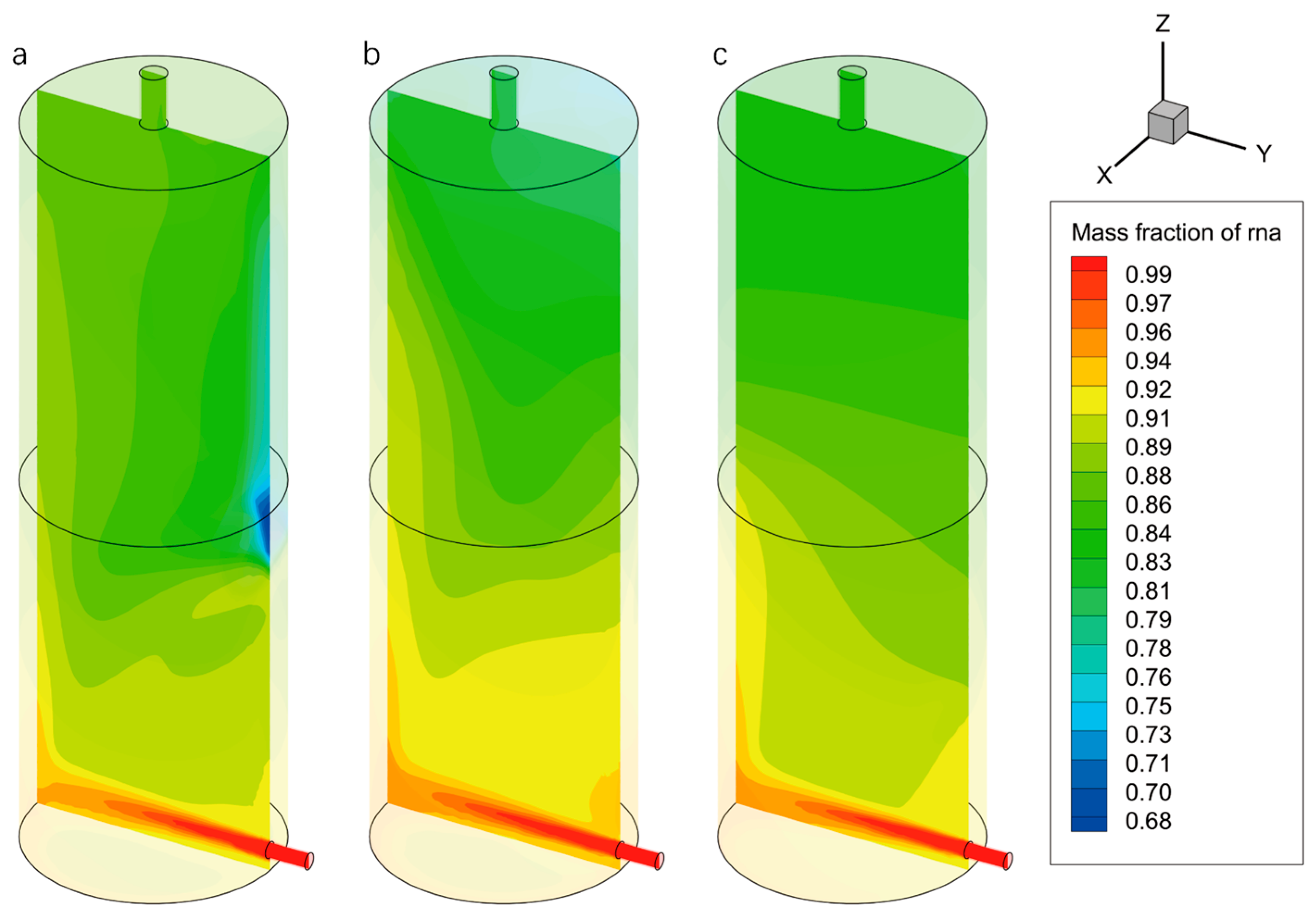 Figure 9c). This is attributed to the increased number of vortex structures and higher turbulent kinetic energy caused by excessive inlet velocity. Although these factors intensify convection and accelerate mass exchange rates, they also introduce a certain degree of negative impact on the overall uniformity of fixative distribution.