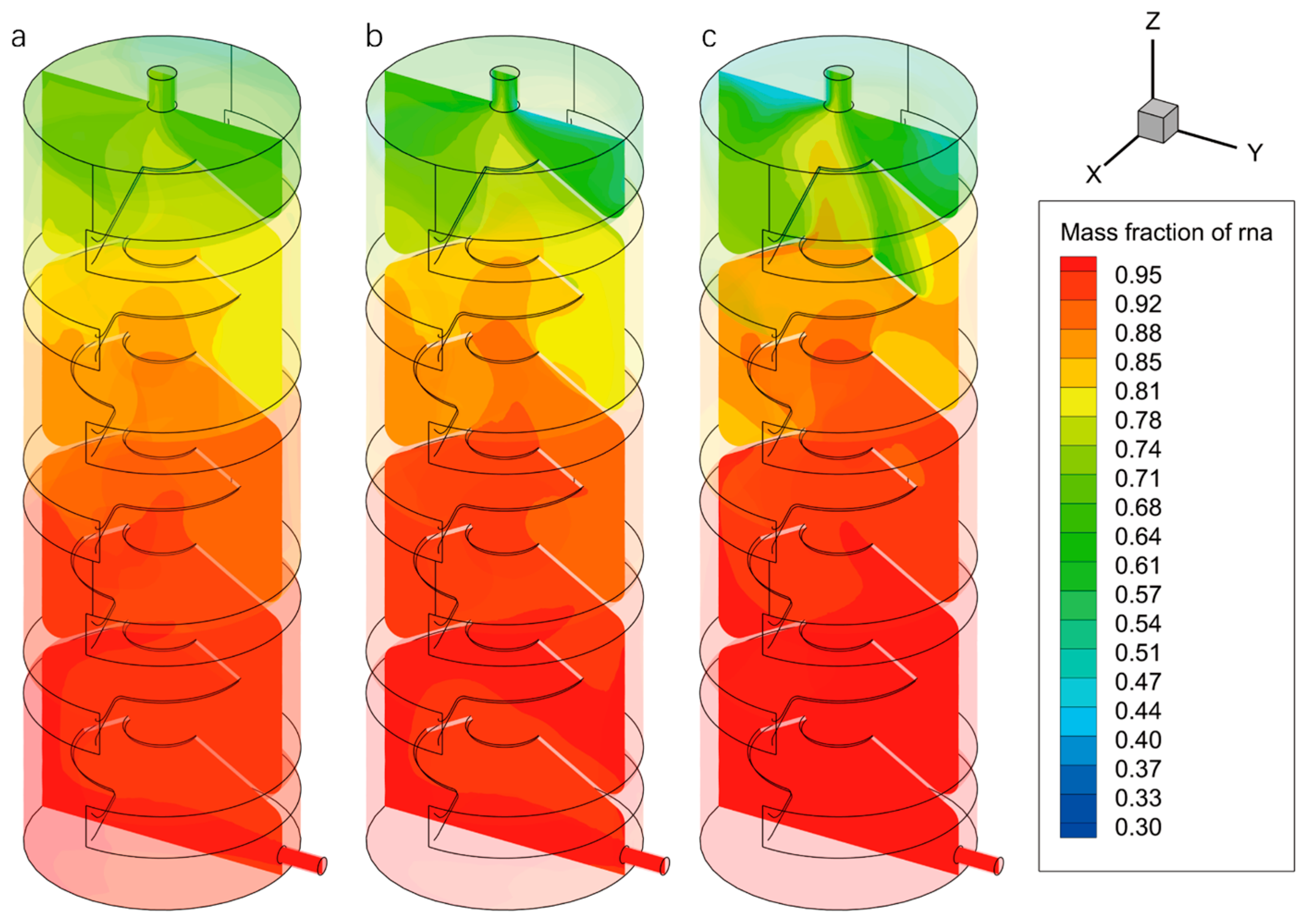 Figure 13e,f). Numerical simulations were conducted to comprehensively assess the impact of these geometric variations on the flow field structure and mass transfer efficiency.