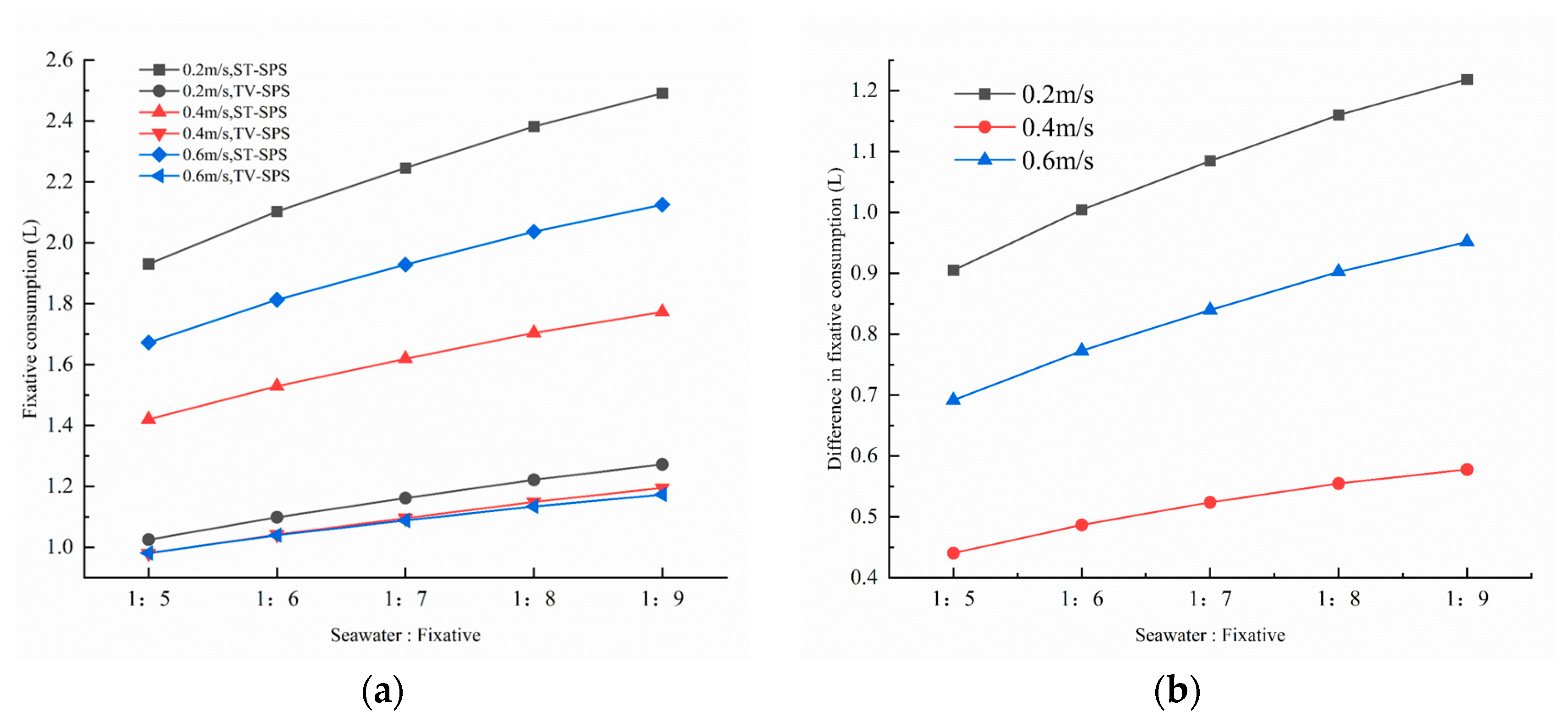 Under the volume ratio of seawater to fixative equals 1:5, which corresponds to the minimum fixative consumption for all inlet velocities, the TV-SPS achieves a 44.95% reduction in fixative consumption compared to the ST-SPS (TV-SPS: 1.42 L vs. ST-SPS: 0.98 L), as illustrated in