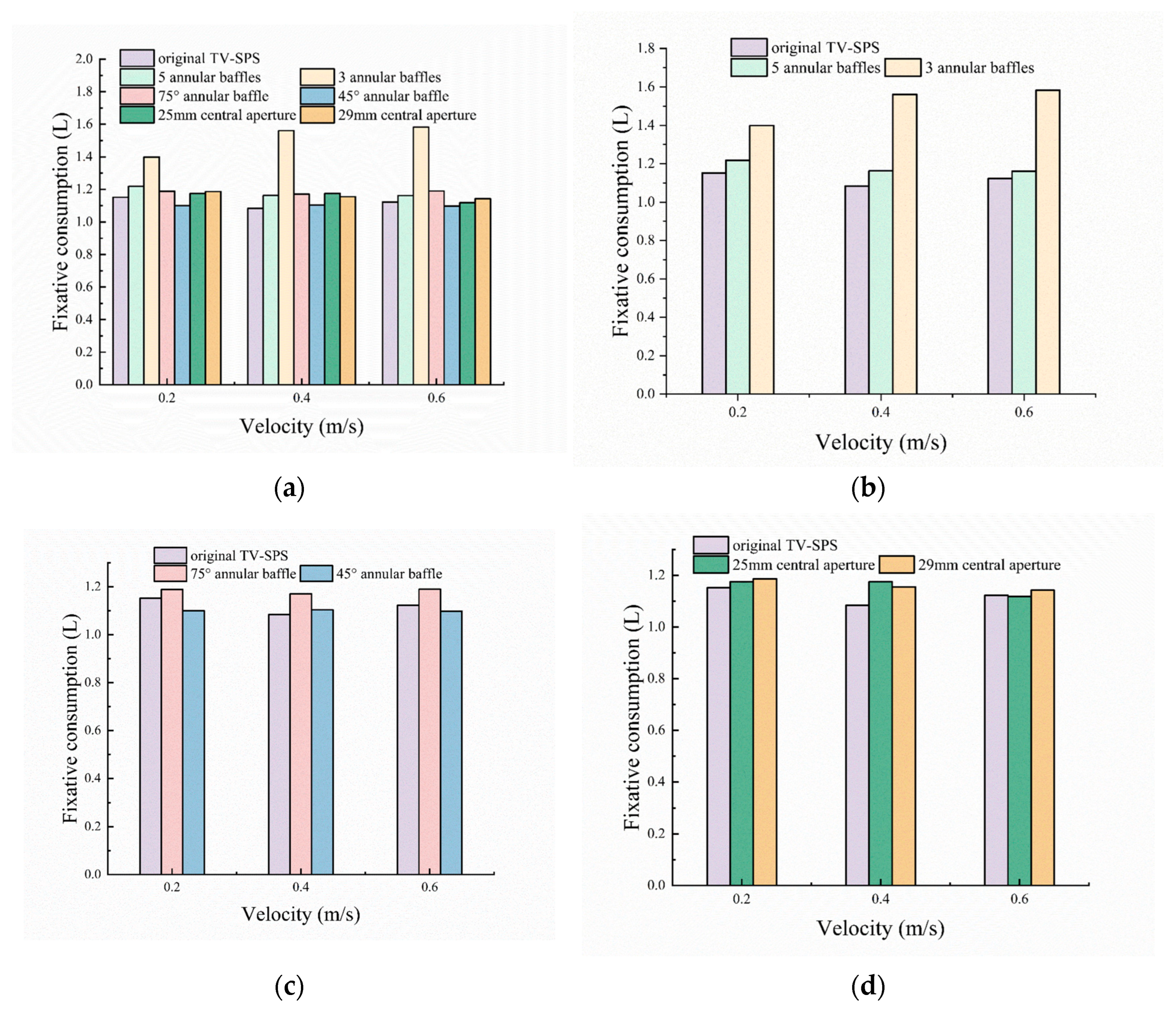 v = 0.6 m/s, respectively. Overall, baffle inclination angle has a limited effect on fixative consumption, with reductions of 41.20% and 36.28% compared to the ST-SPS, and only slight deviations from the 1.15 L used by the original TV-SPS. Notably, the 45° baffle structure exhibits low sensitivity to inlet velocity variations, maintaining stable fixative consumption across the 0.2–0.6 m/s range (