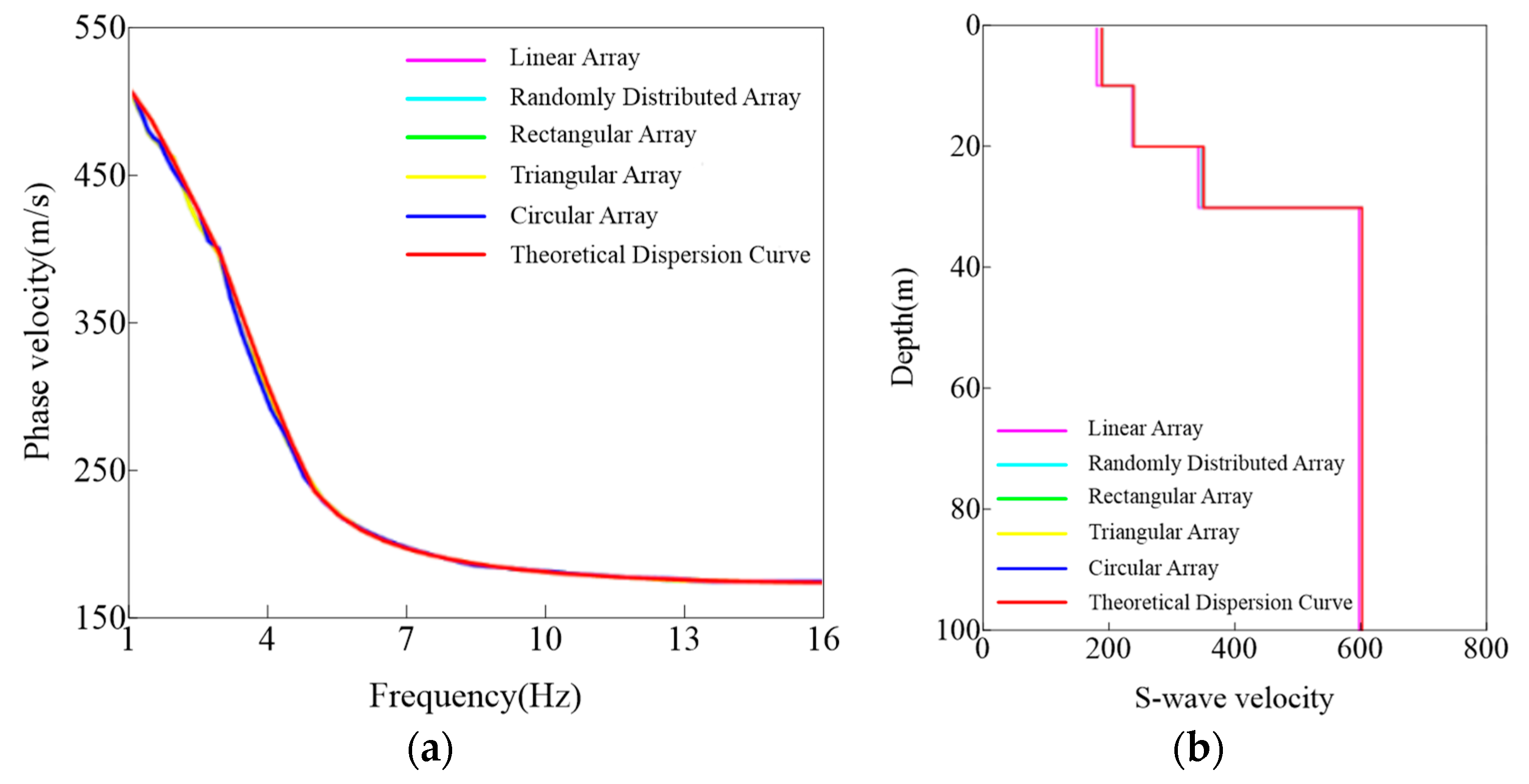 Figure 8b, the inversion results likewise demonstrate good agreement with the theoretical model. Except for the linear array—which displays noticeable mismatches at depths of approximately 0–10 m and 20–30 m—the remaining array types produce inverted S-wave velocity structures that closely match the theoretical model. These observations indicate that among the five tested array geometries, the rectangular, triangular, and circular arrays provide superior dispersion imaging and, consequently, more reliable inversion results.