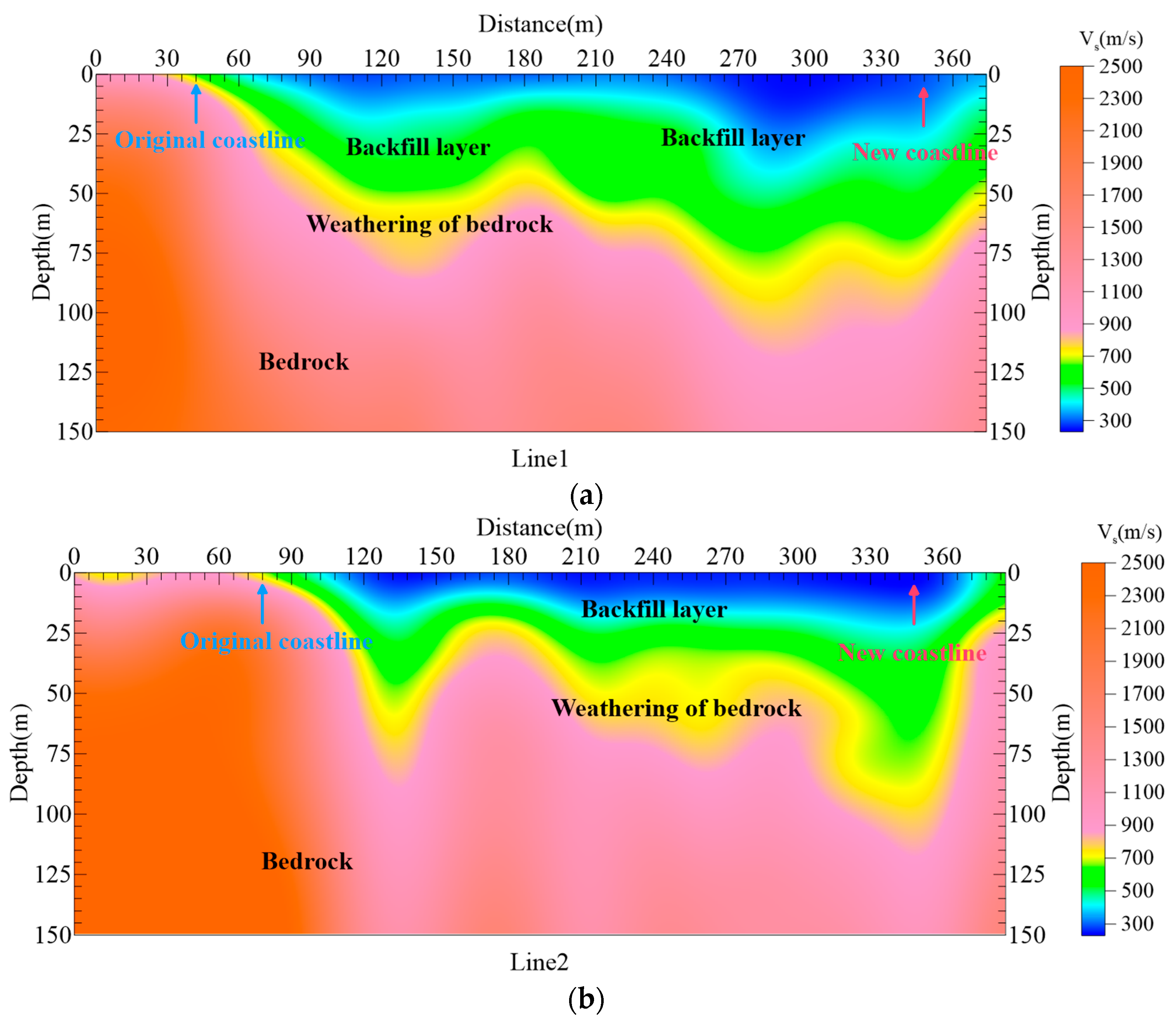 Figure 14a presents the S-wave velocity profile along Line 1. Along Line 1, the near-surface zone from 0 to approximately 42 m is dominated by low velocities below 700 m/s, indicating reclaimed sandy fill and silty clay deposits, which are characterized by high compressibility and relatively low bearing capacity. Beyond this distance, Vs rapidly increases to 700–900 m/s and locally exceeds 900 m/s, marking a clear transition into weathered and intact granitic bedrock near the newly constructed seawall. This sharp velocity contrast reliably delineates the boundary between the reclaimed layer and the original geological foundation.