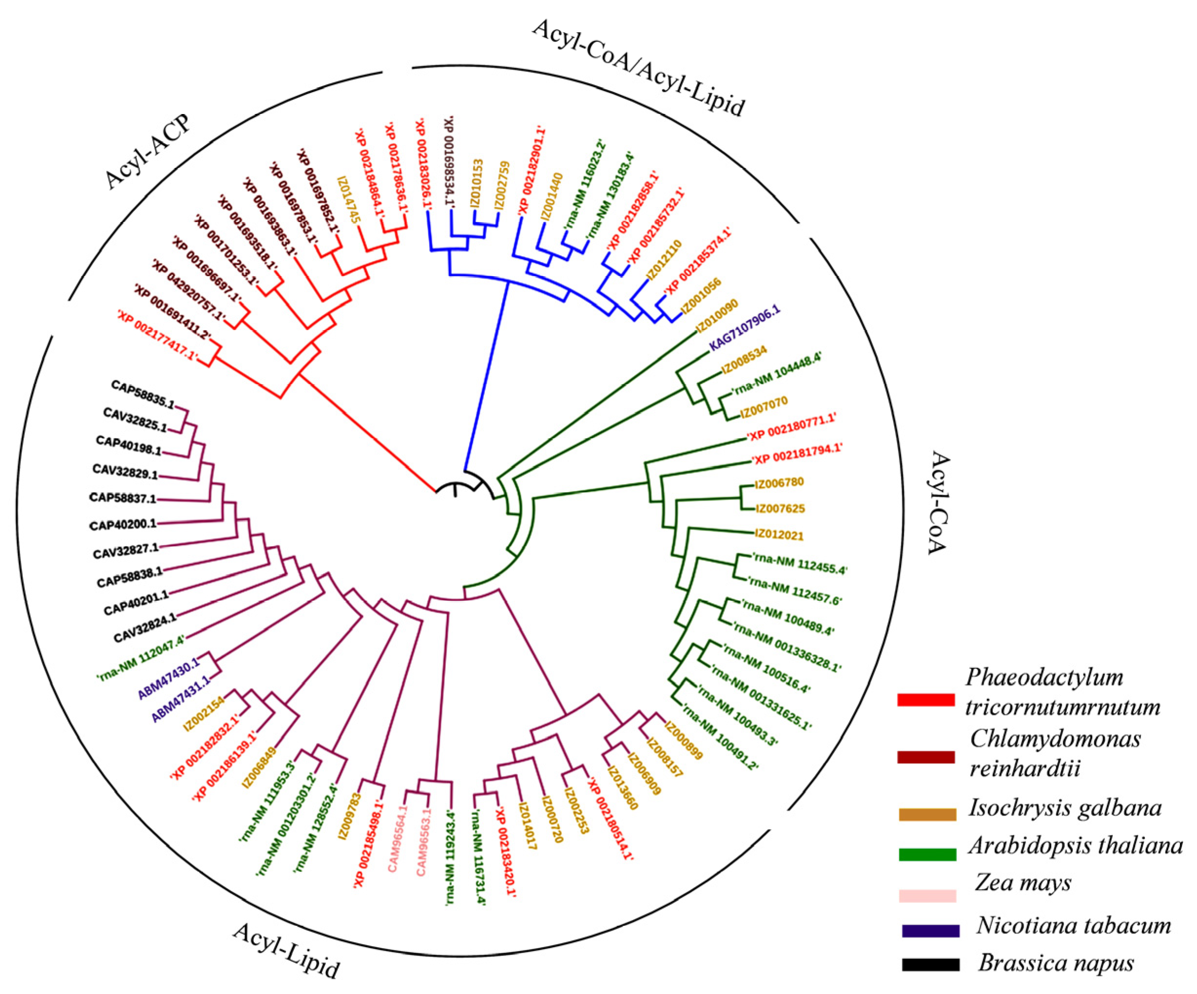 - Members of the FAD gene family can act on both Acyl-CoA, and Acyl-Lipid substrates, hence their classification into the Acyl-CoA/Acyl-Lipid subfamily. For example, Ptd5α and Ptd5b, as well as Ptd6 and Pt22510, exhibit high sequence homology, indicating their evolutionary conservation. Based on phylogenetic relationships, members of the PtFAD gene family in P. tricornutum primarily belong to the Acyl-CoA/Acyl-Lipid and Acyl-Lipid subfamilies [33].