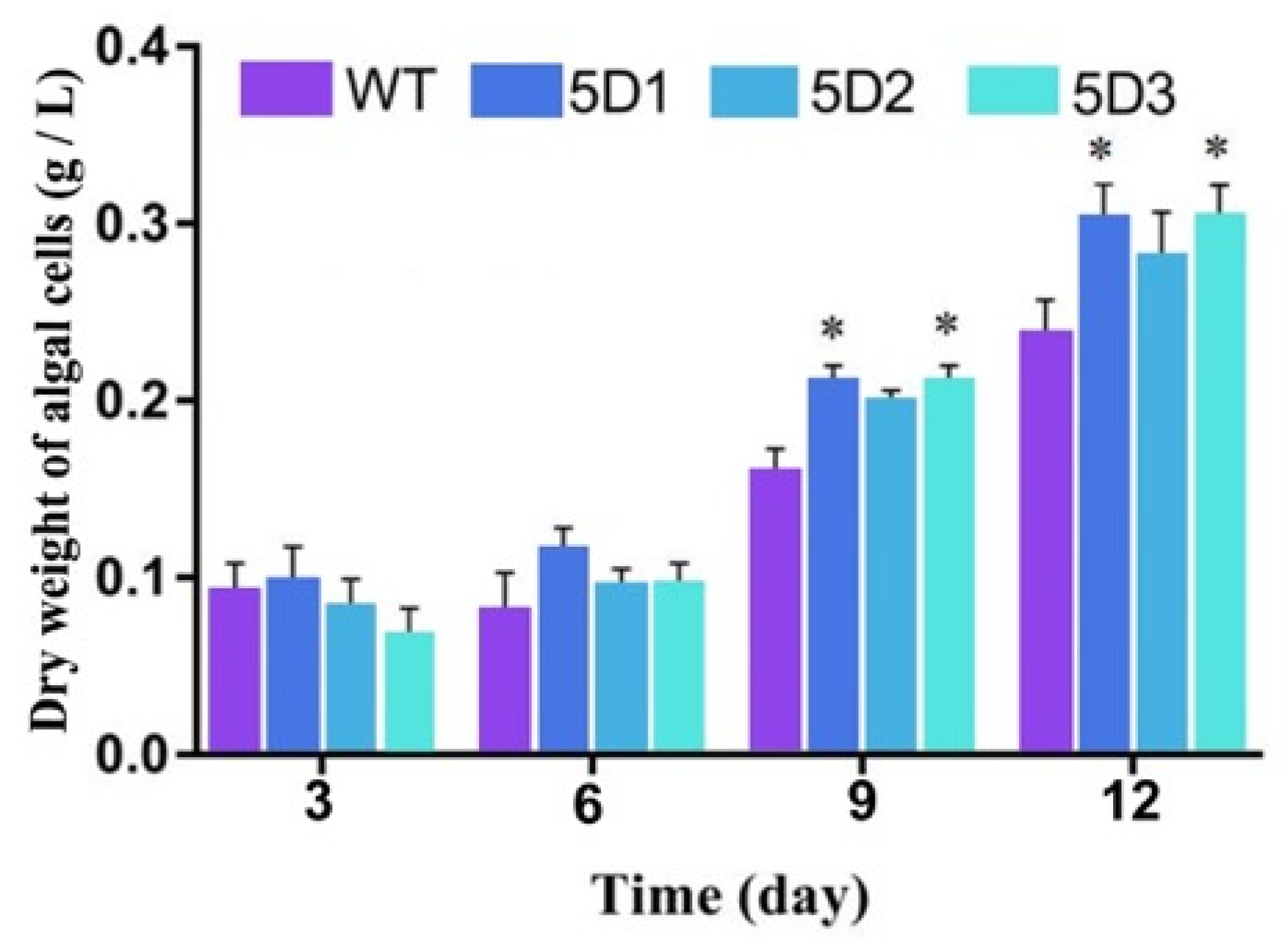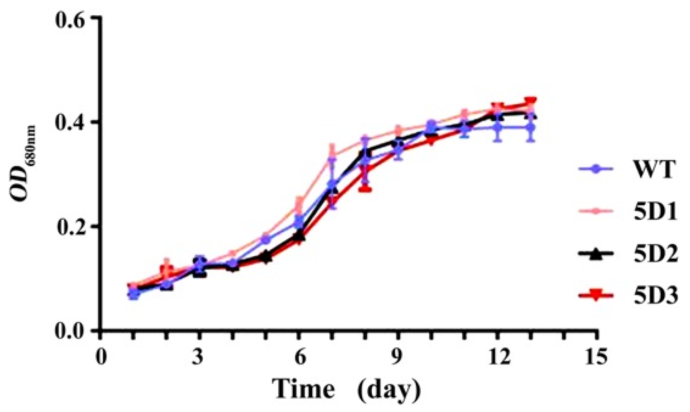 3.6. Construction of Ptd5α Gene Overexpression Vector and Acquisition of Overexpression Algal Strains