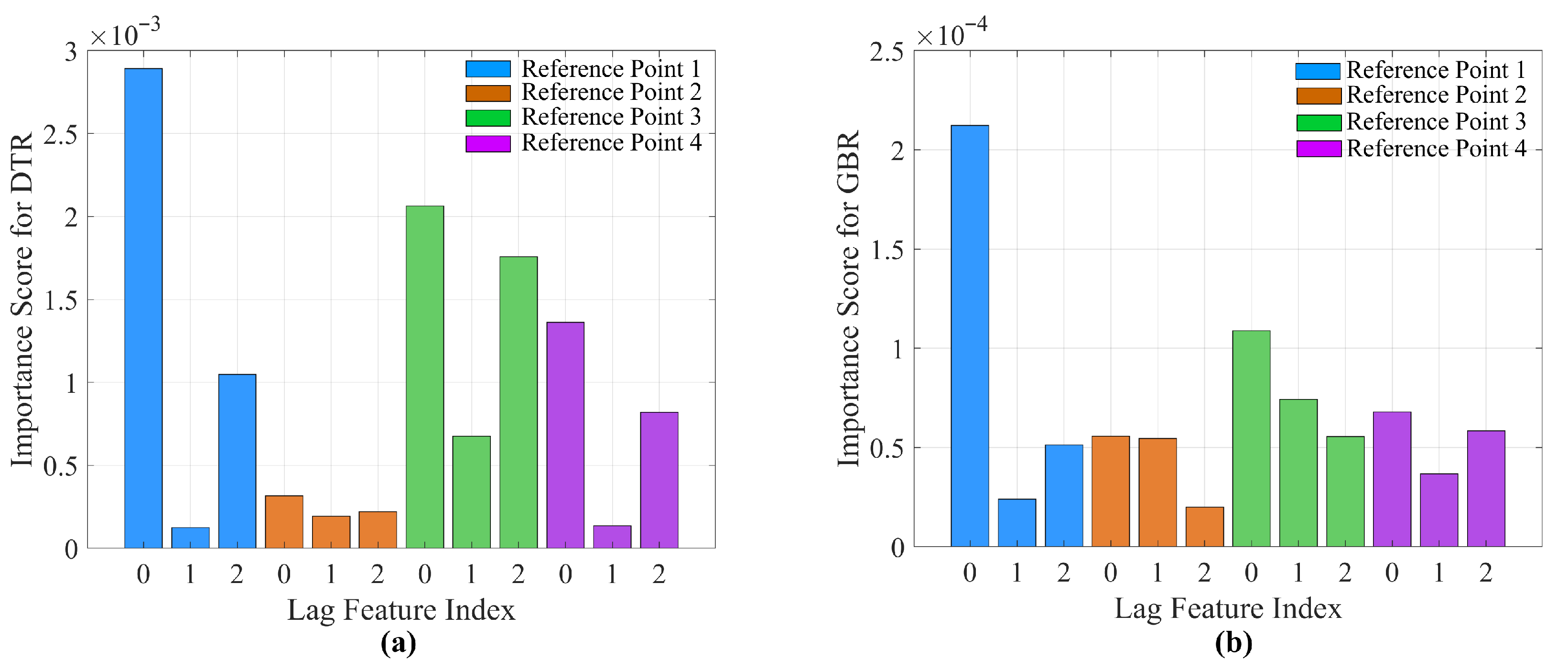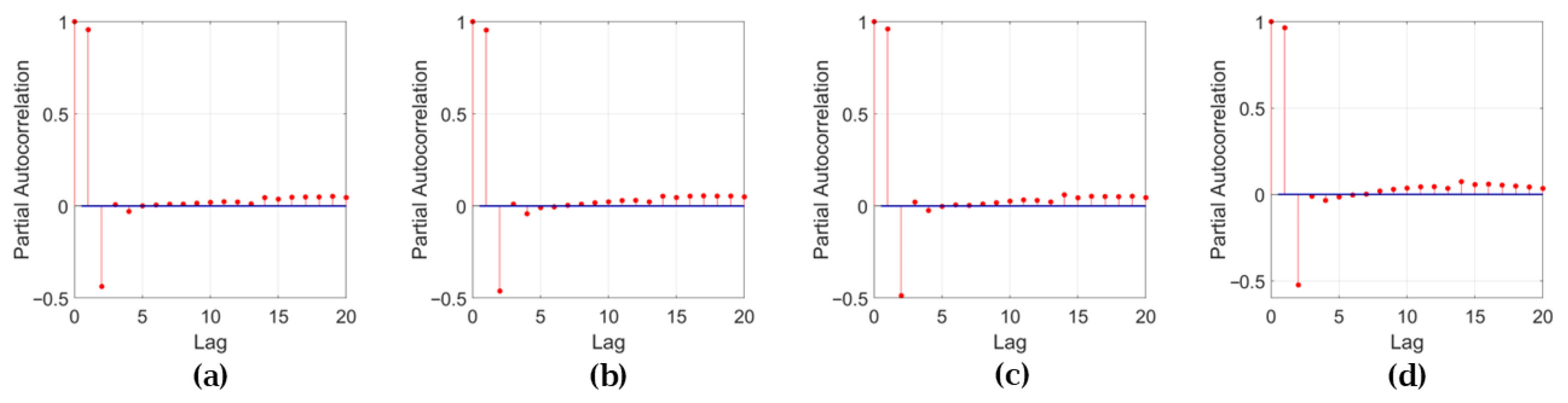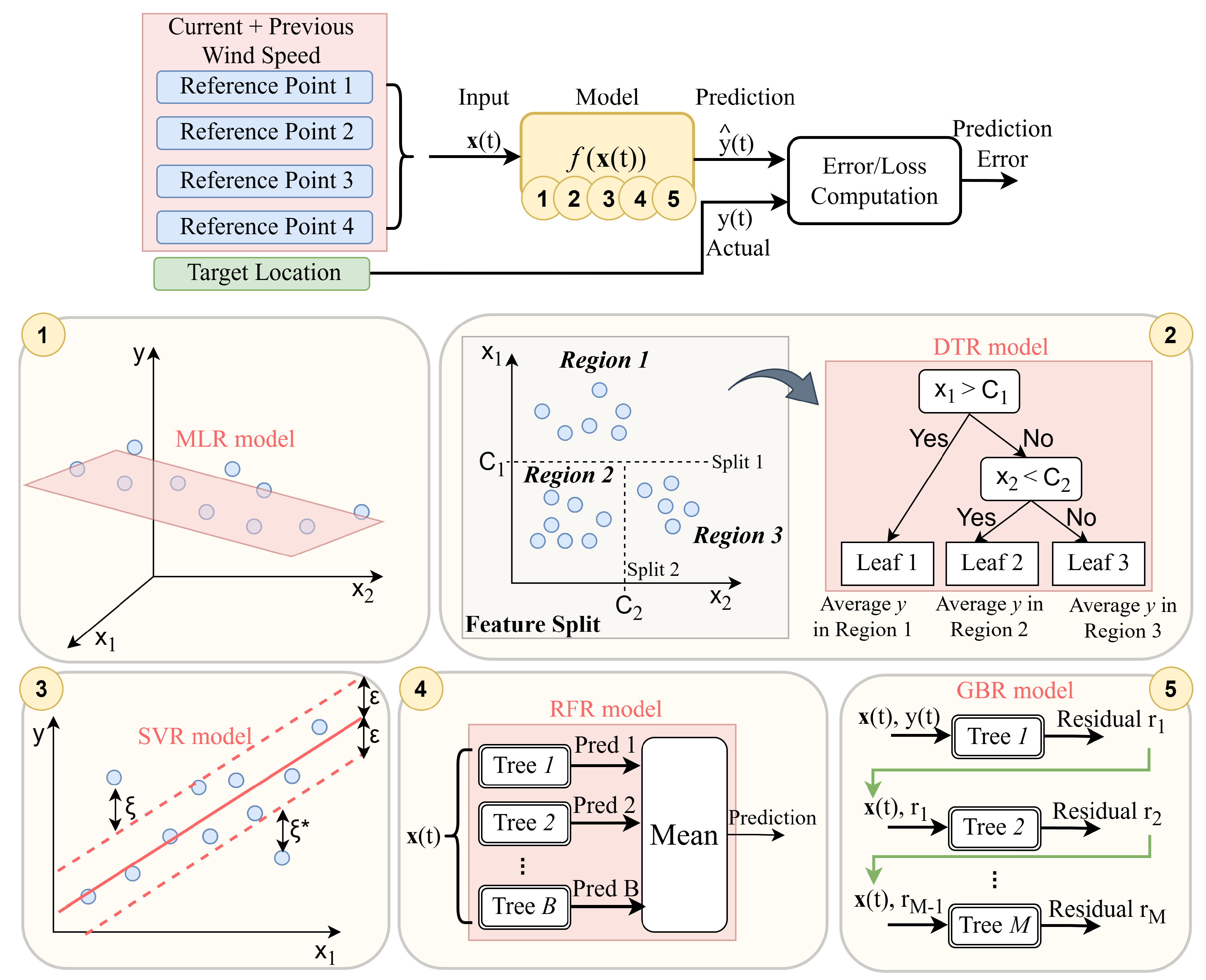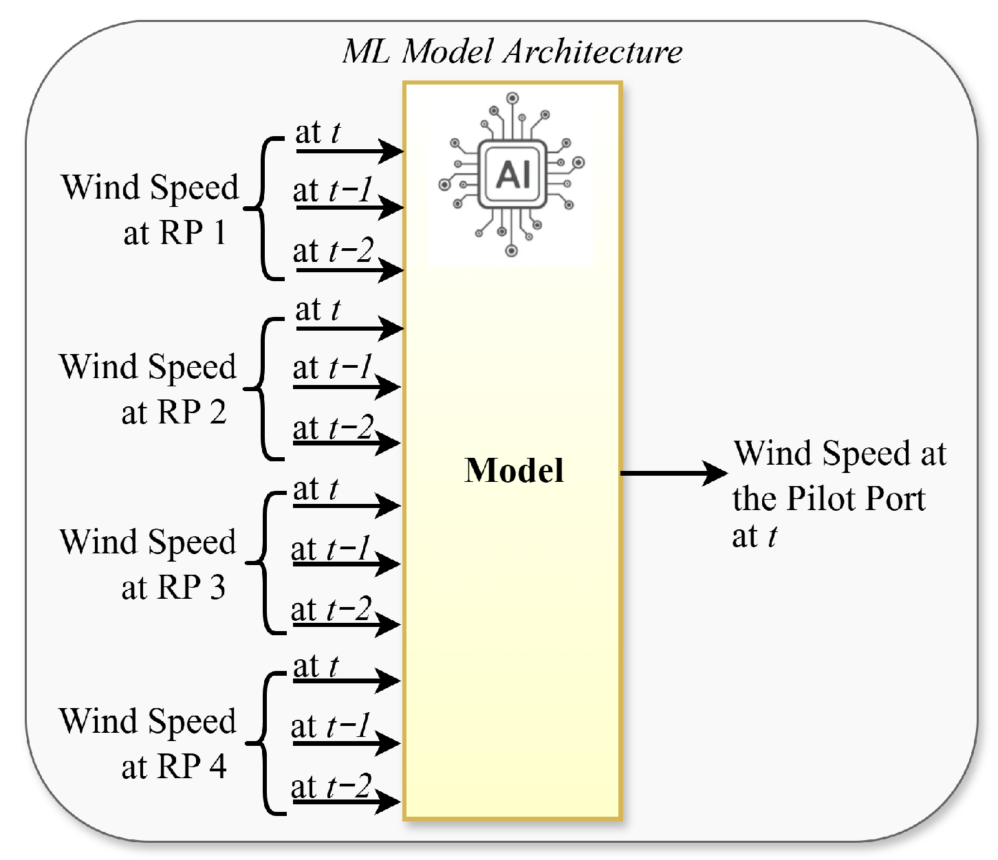 - Feature Matrix Construction: For supervised learning models, the feature space was constructed by combining the wind speed values from the four reference points at each time step, while the target variable corresponded to the measured wind speed at at the pilot port.