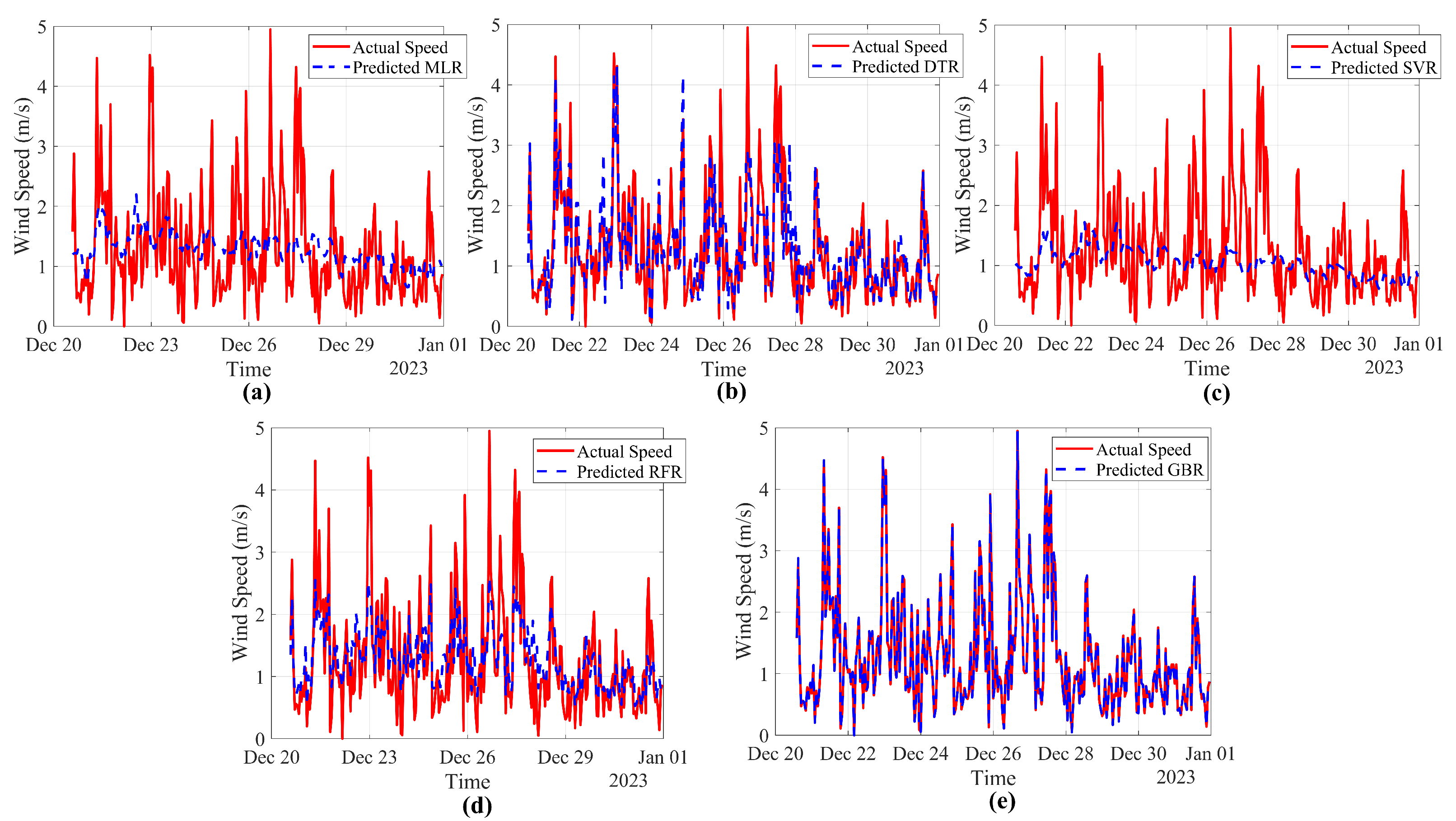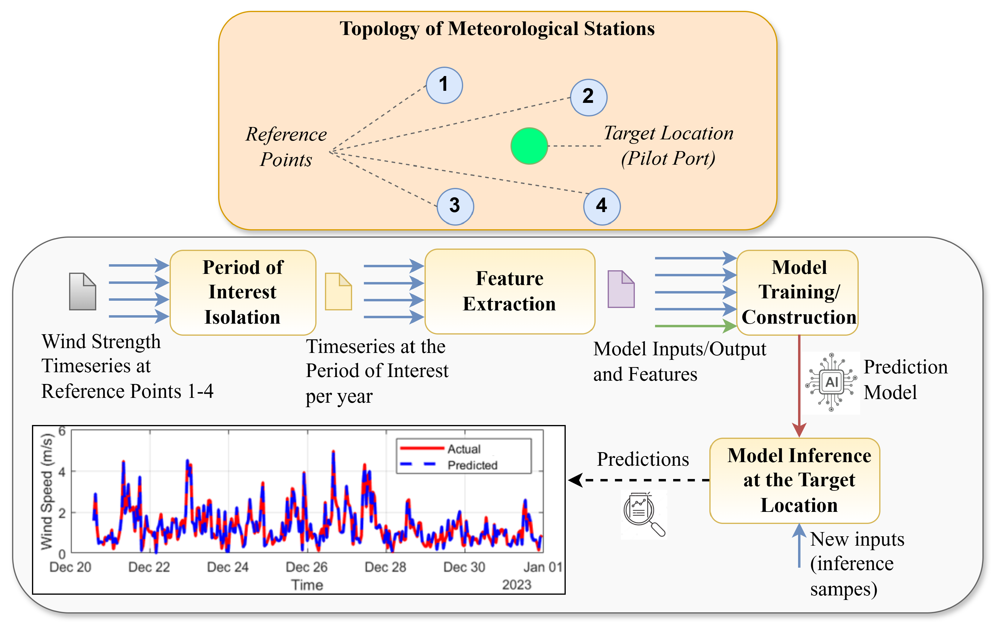- Through extensive validation using real in situ wind speed measurements at the pilot port (Chalkida, Greece), we demonstrate that ensemble-based ML models, particularly GBR, offer significantly improved prediction accuracy in short-term forecasting scenarios. In long-term predictions, simpler tree-based models such as DTR remain competitive due to their lower variance and robustness to overfitting.
