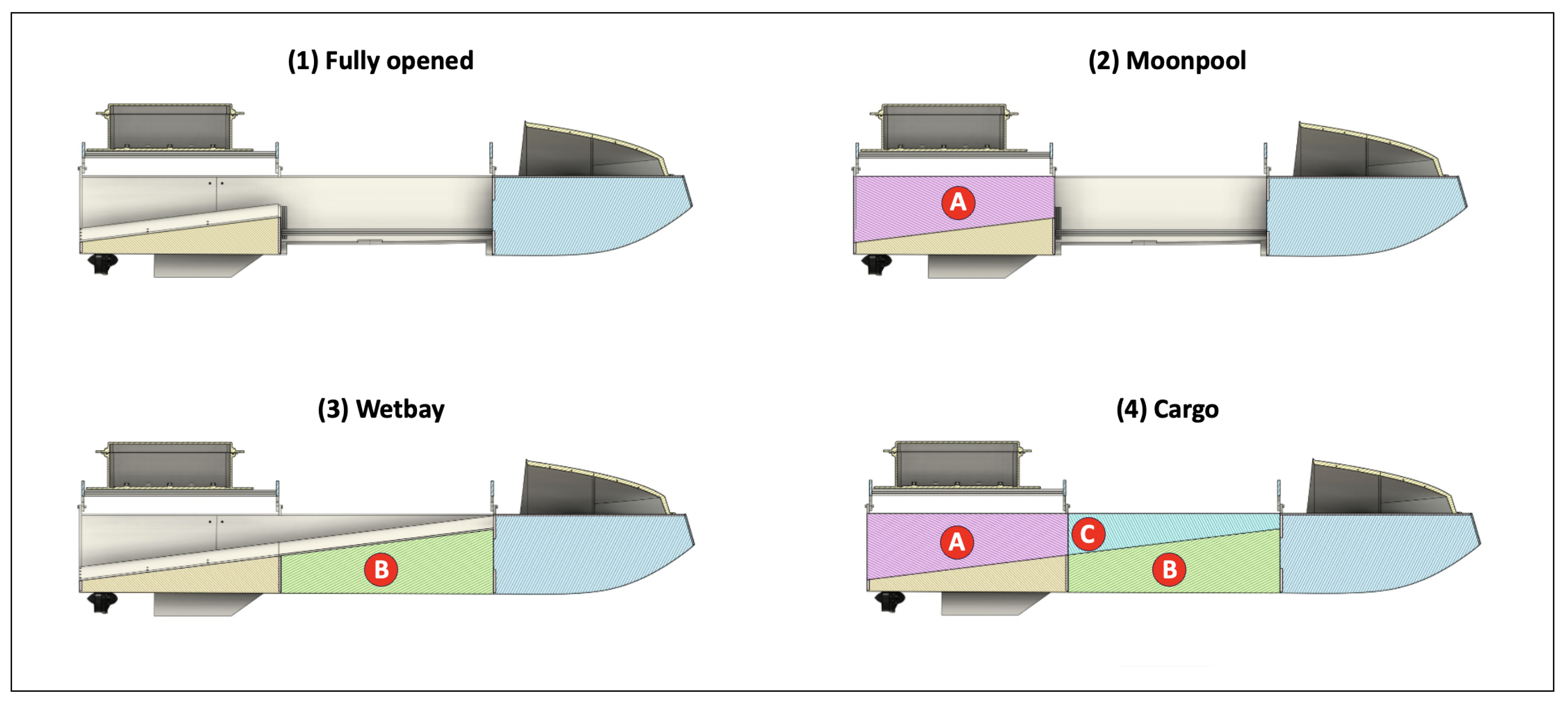 The moonpool mode can carry out tasks such as water quality assessment, ROV (Remotely Operated Vehicle) launch and recovery, and bathymetric surveying. The moonpool is 0.68 m long and 0.40 m wide.