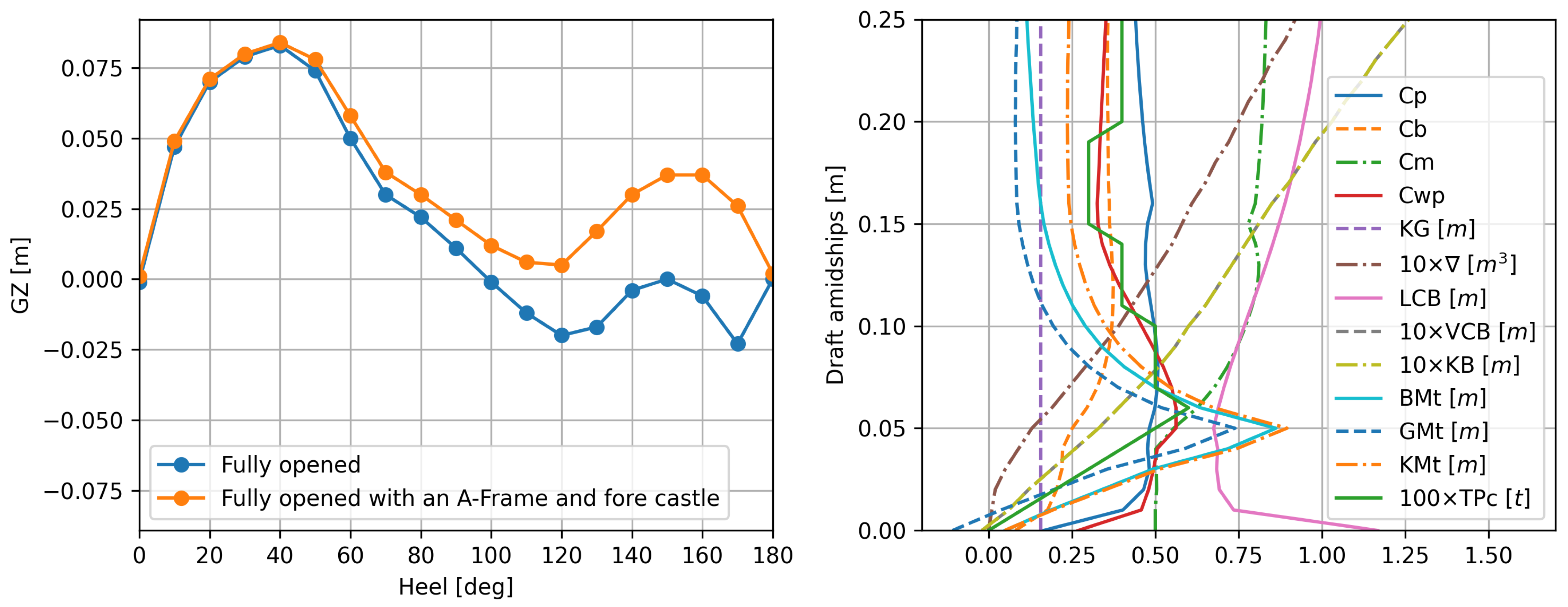 Figure 4 shows the GZ curve in blue only for the vessel in the fully opened mode. An A-Frame in the aft and a closed fore castle in the bow can easily turn the vessel into a self-righting boat, represented by the orange curve in