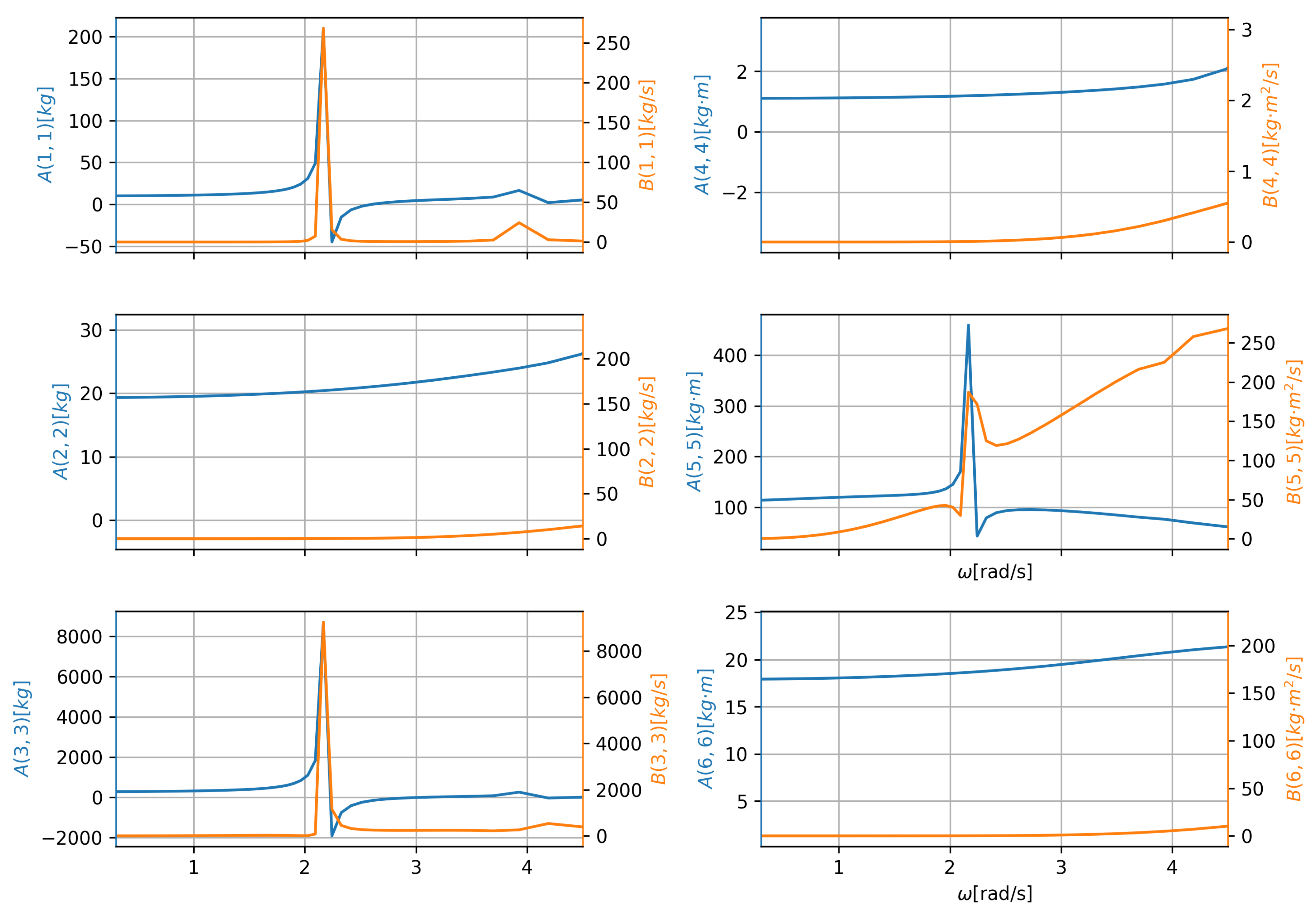 Table 5. The output results include the added mass and damping matrices, load RAOs (Response Amplitude Operators), and displacement RAOs. Some examples of these results are shown in