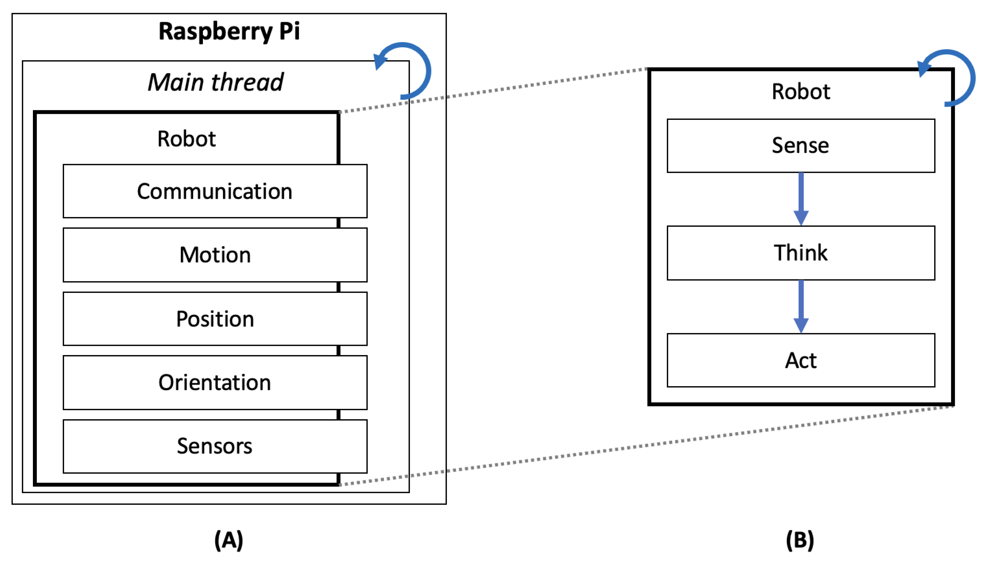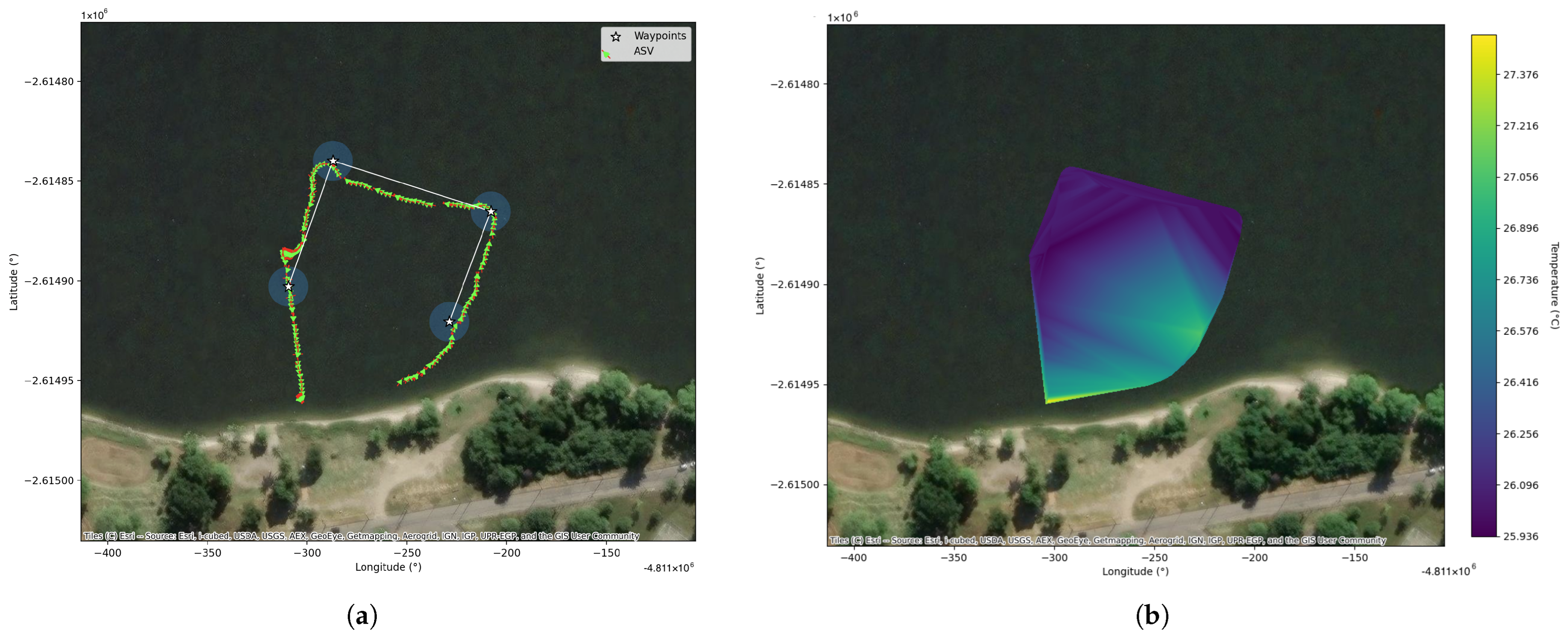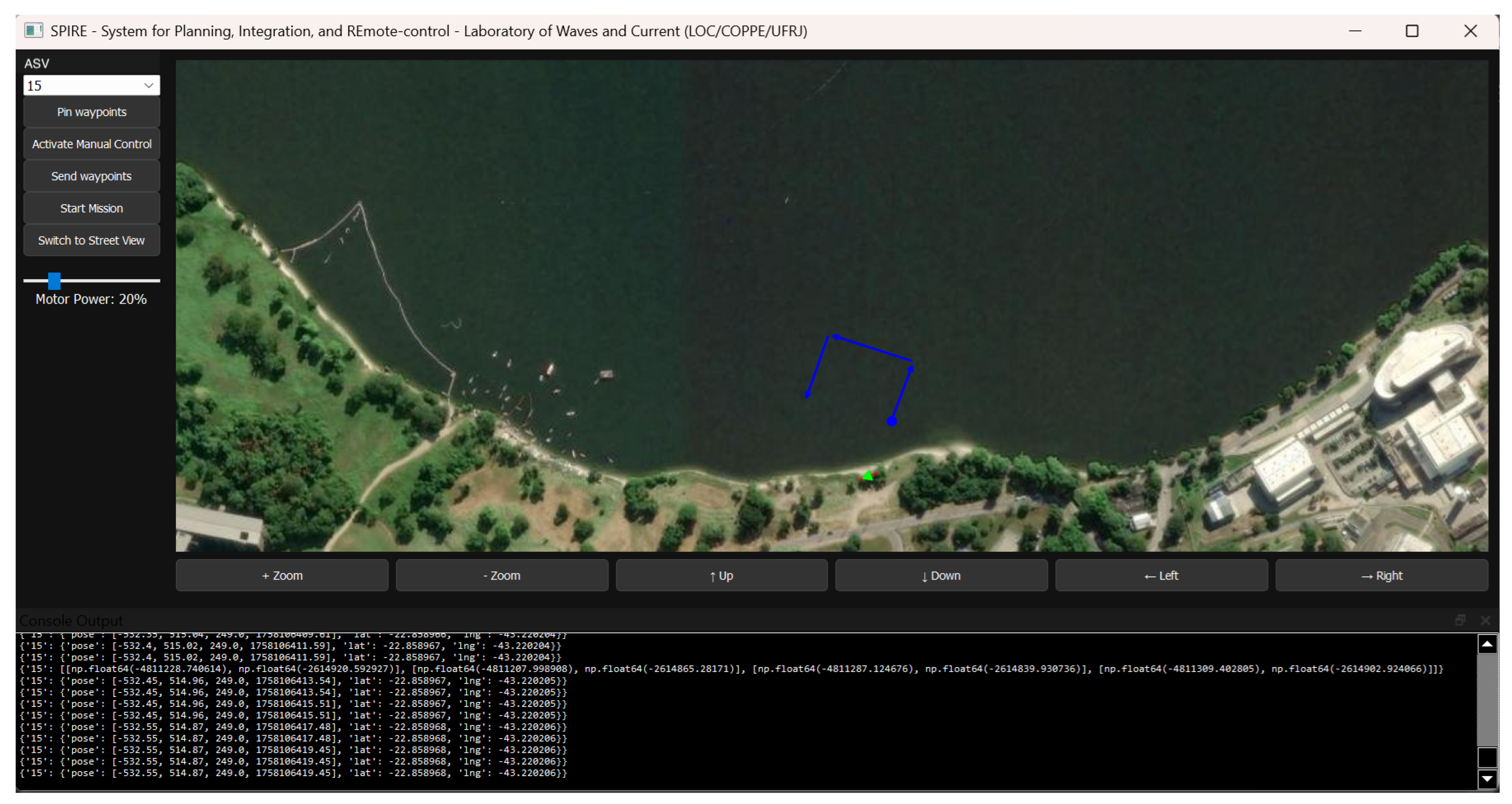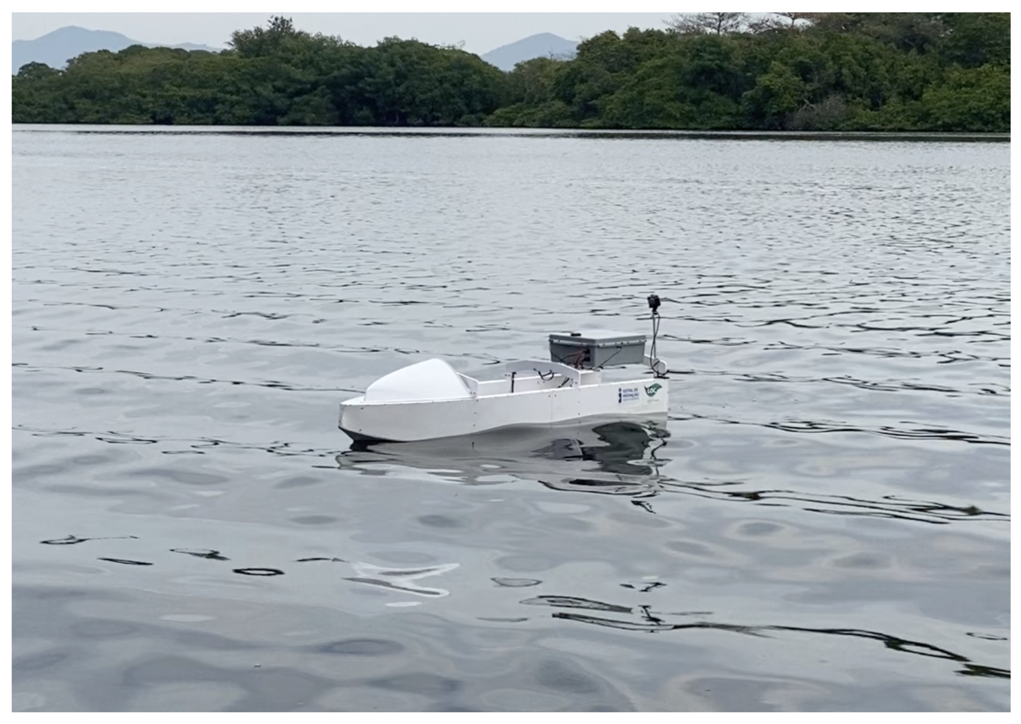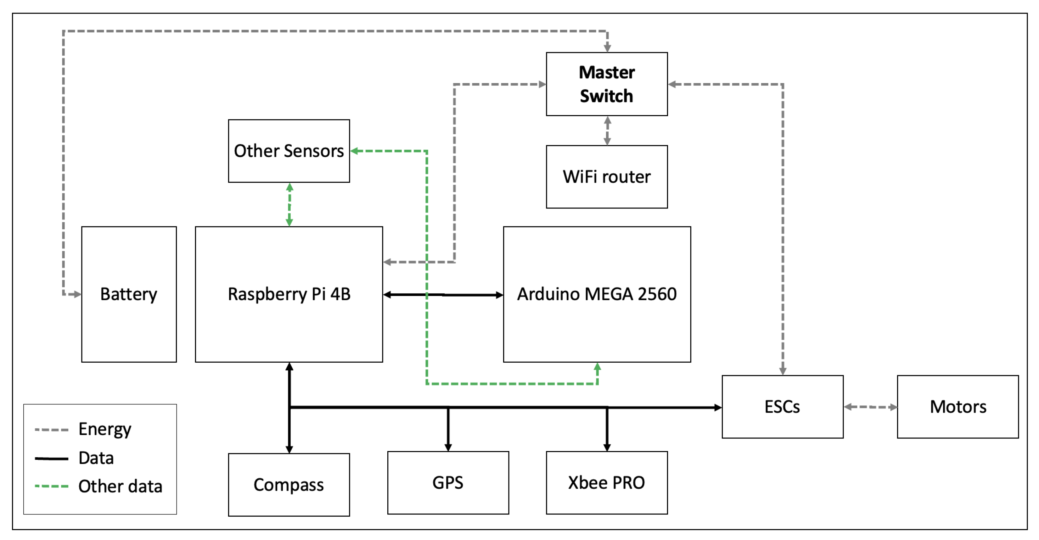 The idea was to place a Master Switch to turn on/off the system. The power source is composed of two LiPo batteries (Leão, Maringá, Paraná, Brazil) with 14.8 V, each having 5200 mAh of capacity. The software runs on the Raspberry Pi 4B (Raspberry Pi, Pencoed, Wales), which is connected to an Arduino MEGA 2560 (Arduino, Monza, MB, Italy) to allow for the use of analog ports and other sensors that are more integrated into this environment. To remotely control the graphical desktop of the Raspberry Pi OS (version 2025-05-06), the boat has its own WiFi router. The Raspberry connects to the main parts of the system (