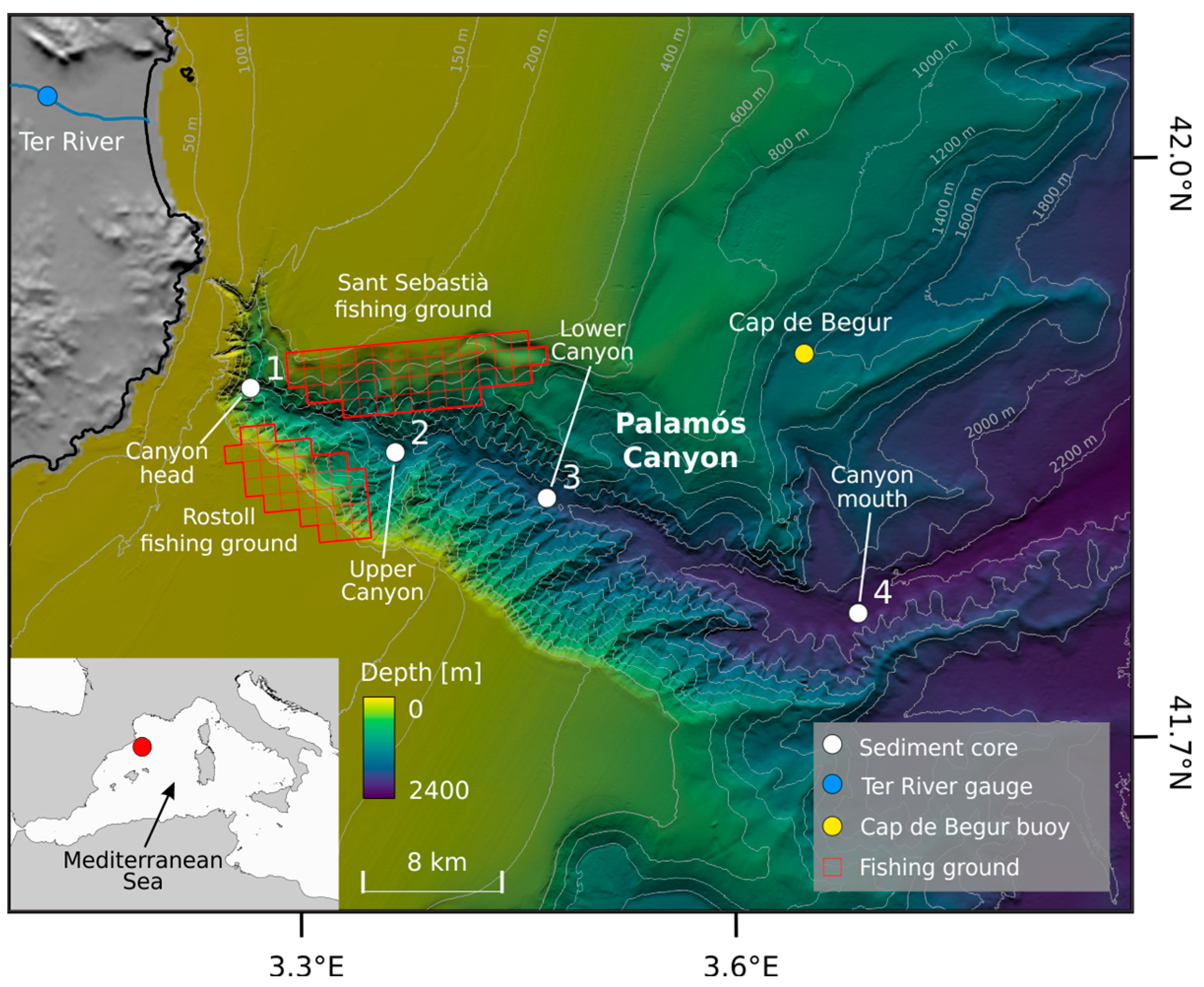 18. Arjona-Camas, M.; Puig, P.; Palanques, A.; Durán, R.; White, M.; Paradis, S.; Emelianov, M. Natural vs. Trawling-Induced Water Turbidity and Suspended Sediment Transport Variability within the Palamós Canyon (NW Mediterranean). Mar. Geophys. Res. 2021, 42, 38. [Google Scholar] [CrossRef]