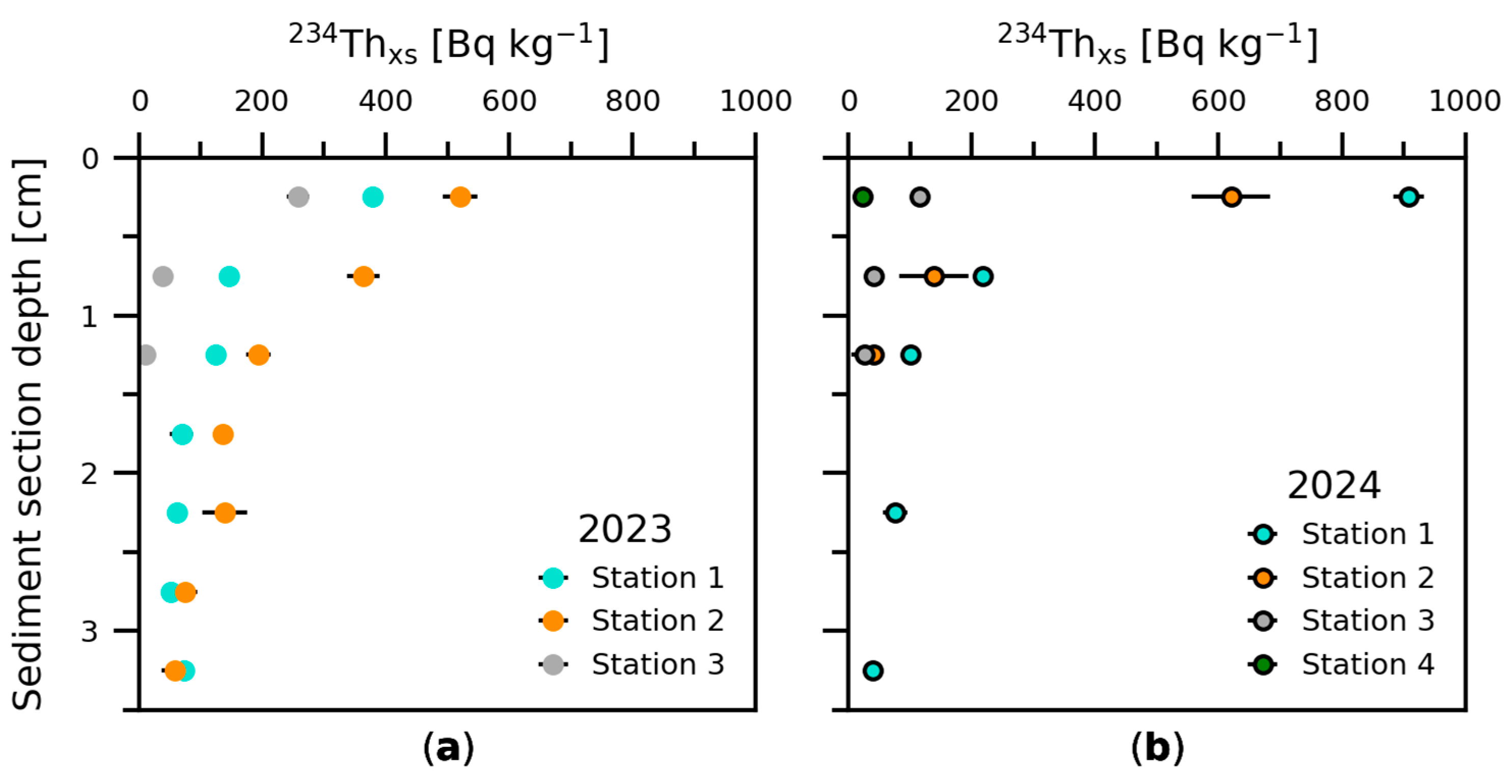 Figure 2. Depth profiles of 234Thxs activity concentrations for sediment cores collected (a) in 2023 and (b) in 2024.