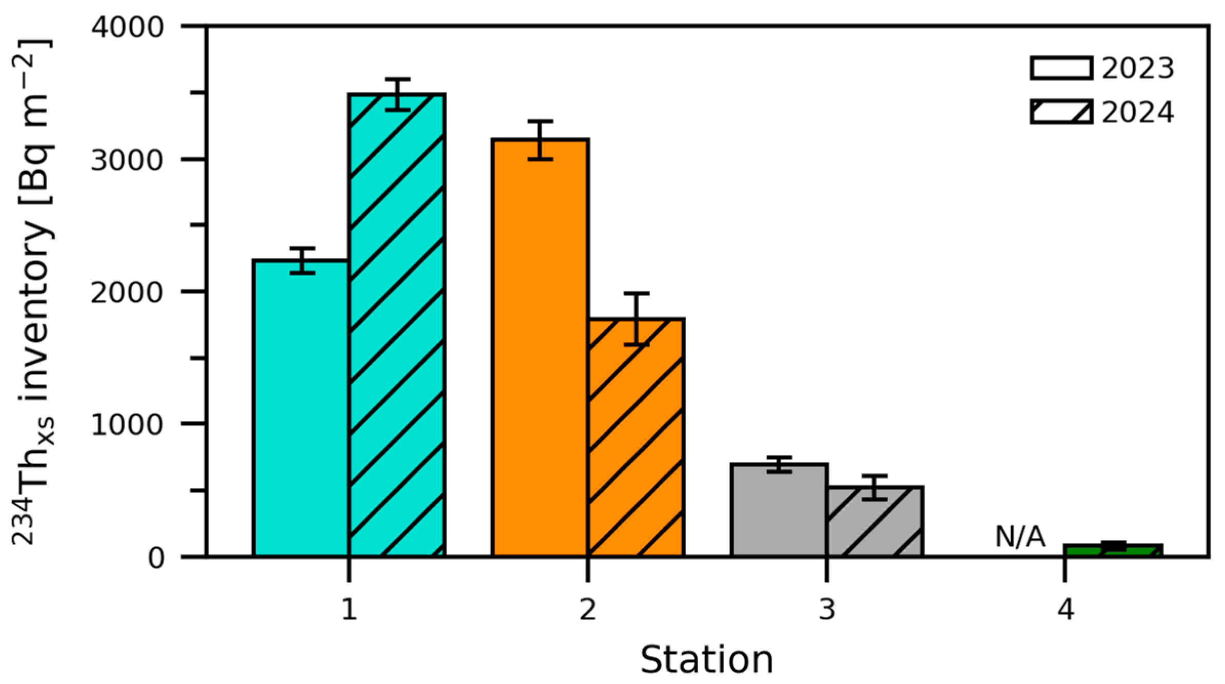 Figure 3. 234Thxs inventories at stations 1 to 4 in 2023 (open bars) and 2024 (hatched bars). Error bars represent the inventory uncertainty of individual core measurements.