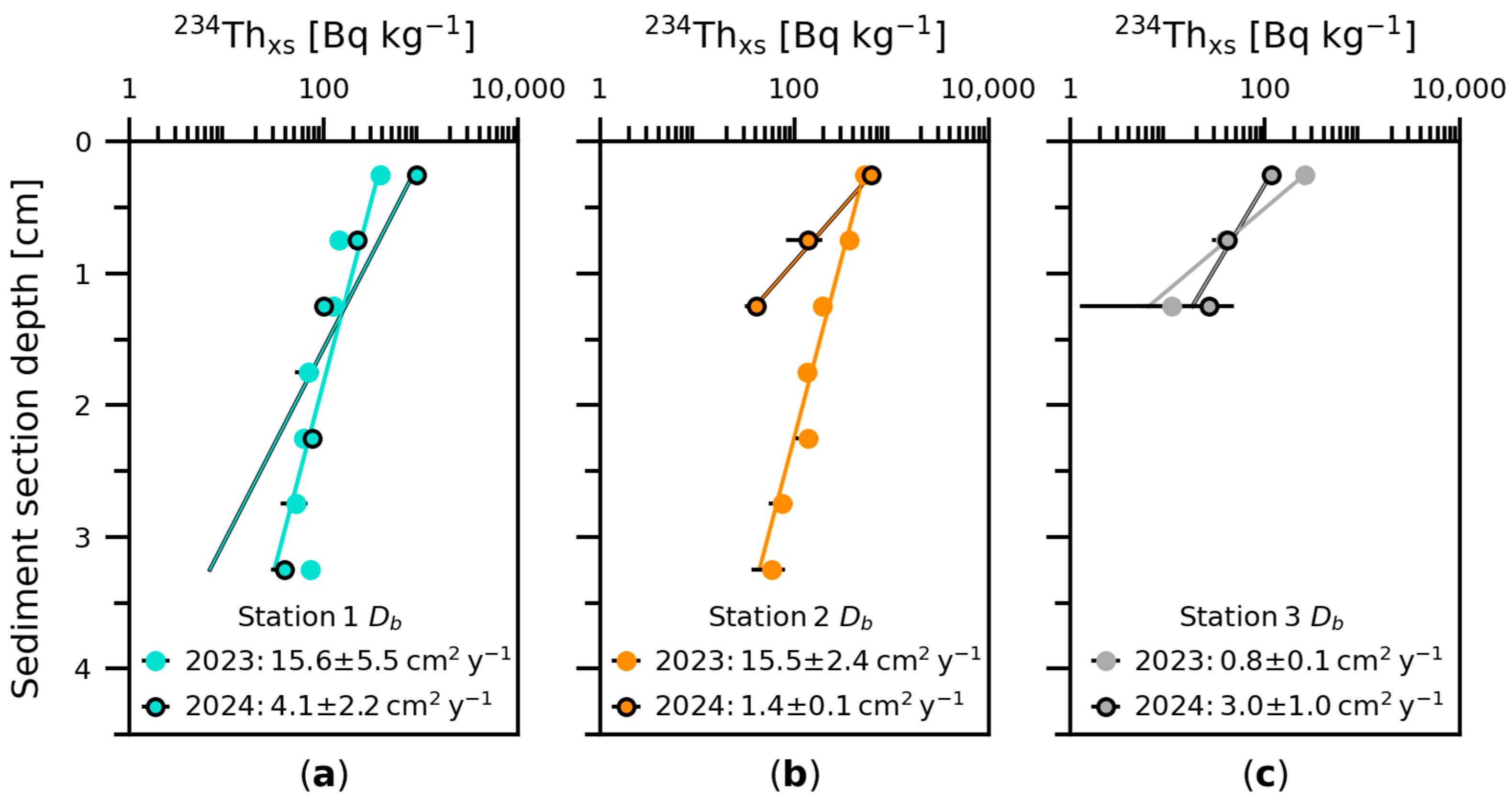 Figure 4. Depth profiles of exponential decrease of 234Thxs activity concentration on log-scale used for the calculation of mixing rates (Db) for 2023 and 2024 sampling campaigns showing (a) station 1, (b) station 2, and (c) station 3. Station 4 could not be sampled in 2023 and the sediment core collected in 2024 only presented detectable 234Thxs activity concentration in the upper 0.5 cm, hindering the calculation of mixing rate.