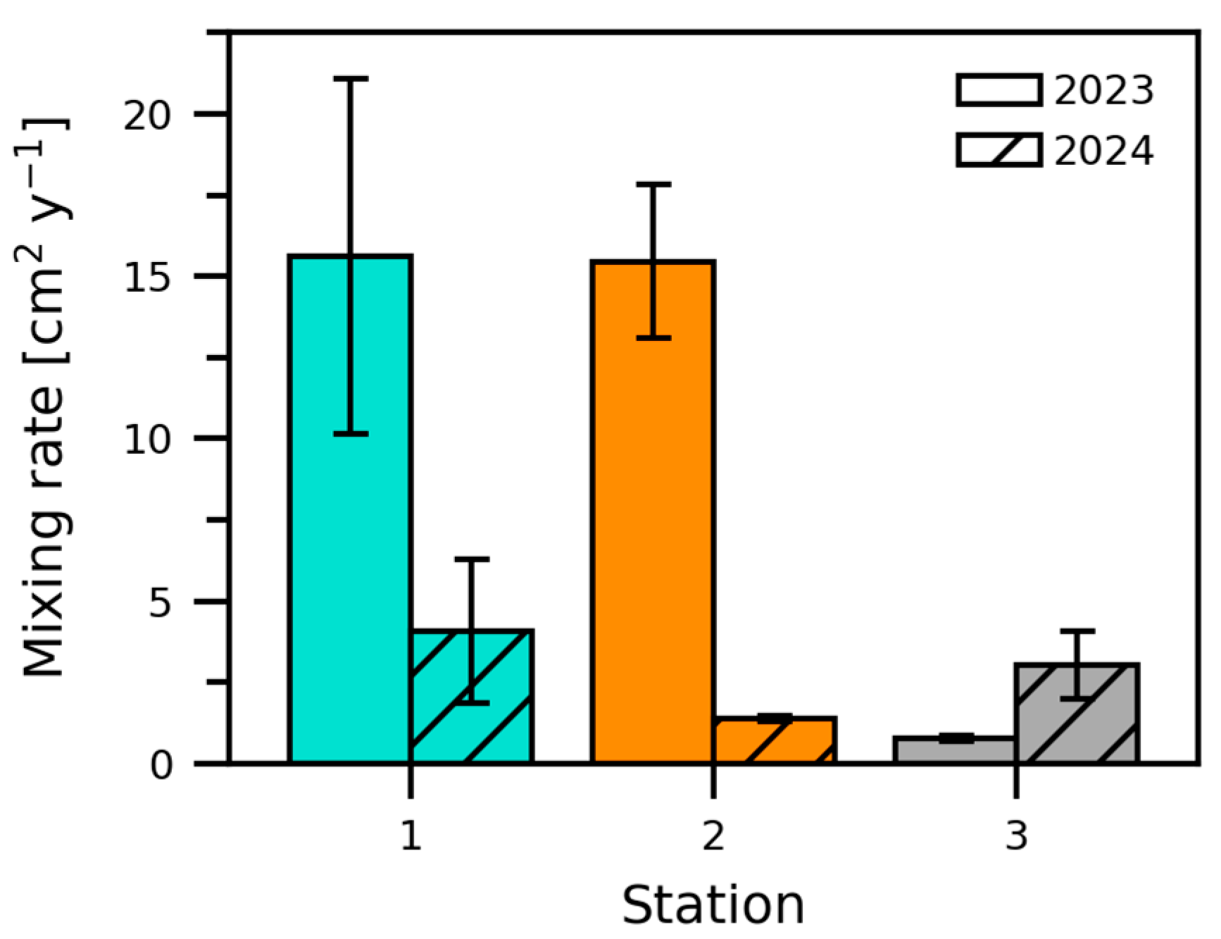 Figure 5. 234Thxs-derived mixing rates at stations 1 to 3 in 2023 (open bars) and 2024 (hatched bars). Error bars represent the rate uncertainty of individual core measurements. Station 4 could not be sampled in 2023 and in 2024 only presented detectable 234Thxs activity concentration in the upper 0.5 cm, hindering the calculation of mixing rate.