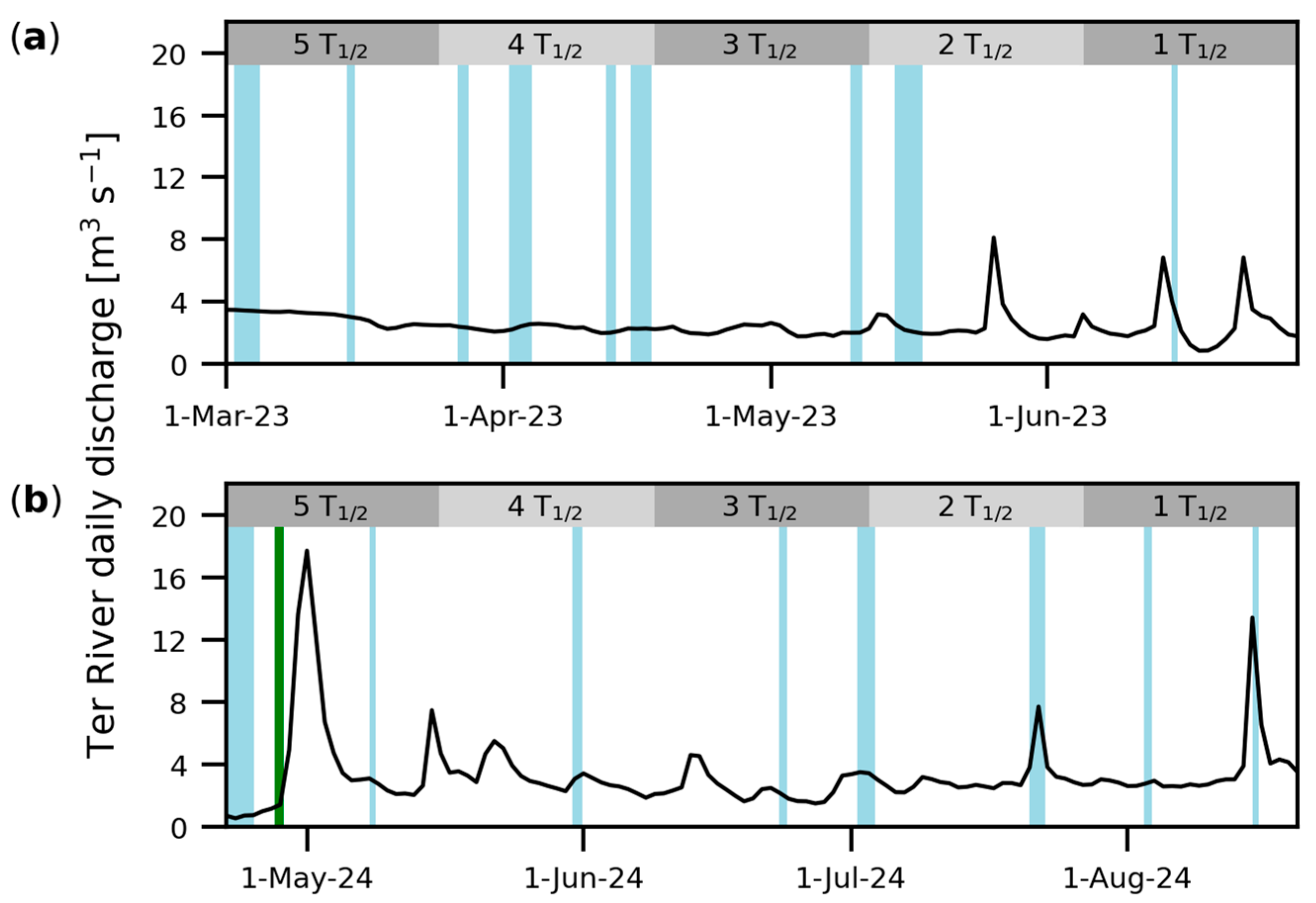 Figure 6. Ter River daily discharge and the occurrence of storms during the ~120 days prior to sampling (a) in June 2023 and (b) in August 2024. Storm events are indicated according to their duration by vertical shadowed areas in the timelines: easterly storms in green, northerly storms in light blue. A striped horizontal gray bar shows the timeframe of five half-lives of 234Th prior to sampling to differentiate more recent events.
