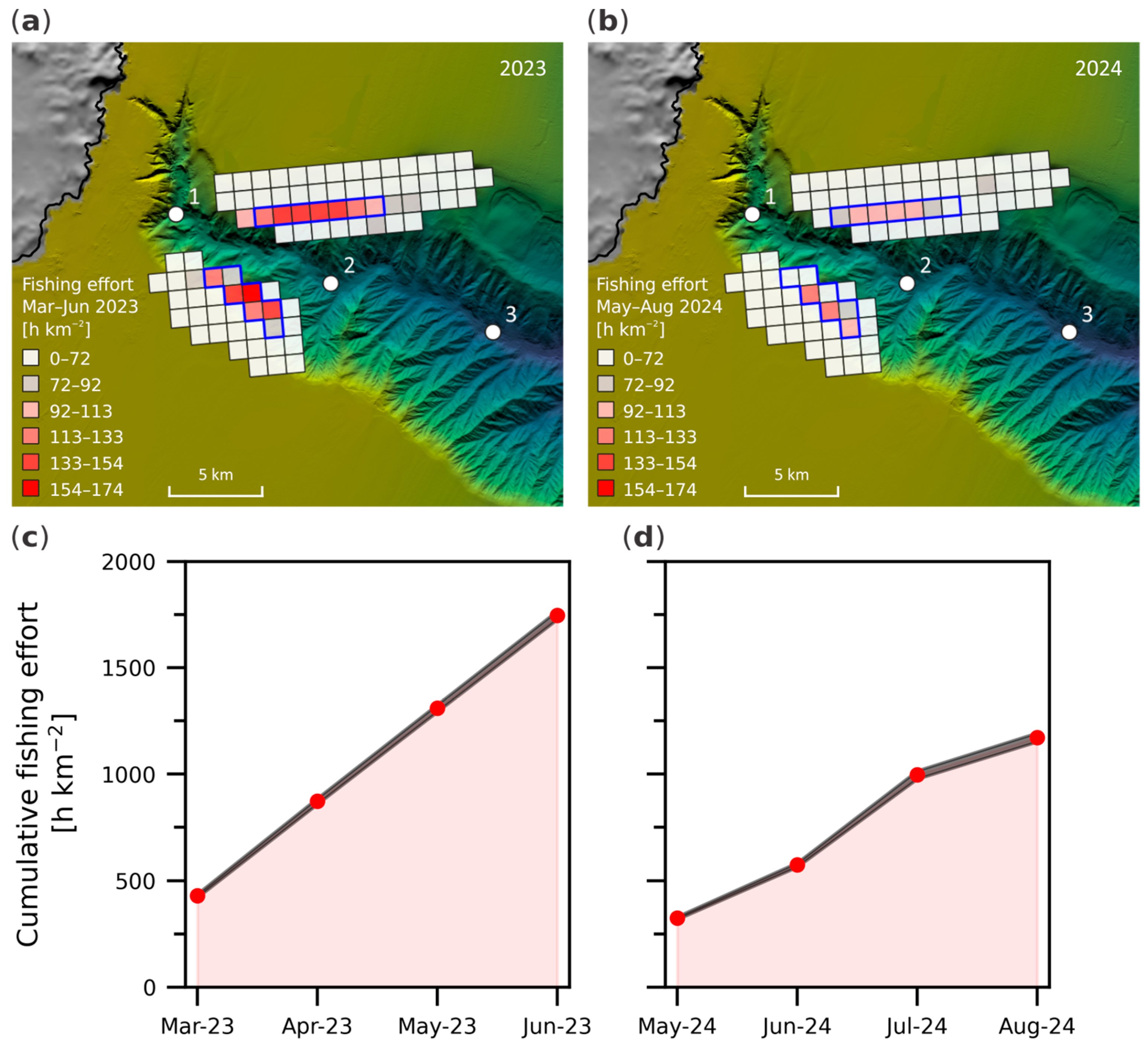 Figure 7. Fishing effort on the main trawling grounds along the flanks of the Palamós Canyon, shown as the sum of computed effort at 1 × 1 km resolution prior to samplings: (a) March–June 2023 and (b) May–August 2024. Sediment coring sites (1–3) are marked as white circles. Cumulative monthly fishing effort over the ~120 days prior to sampling (c) in June 2023 and (d) in August 2024, summed over cells outlined in blue in (a,b). Black shading indicates uncertainty from error propagation of sums.
