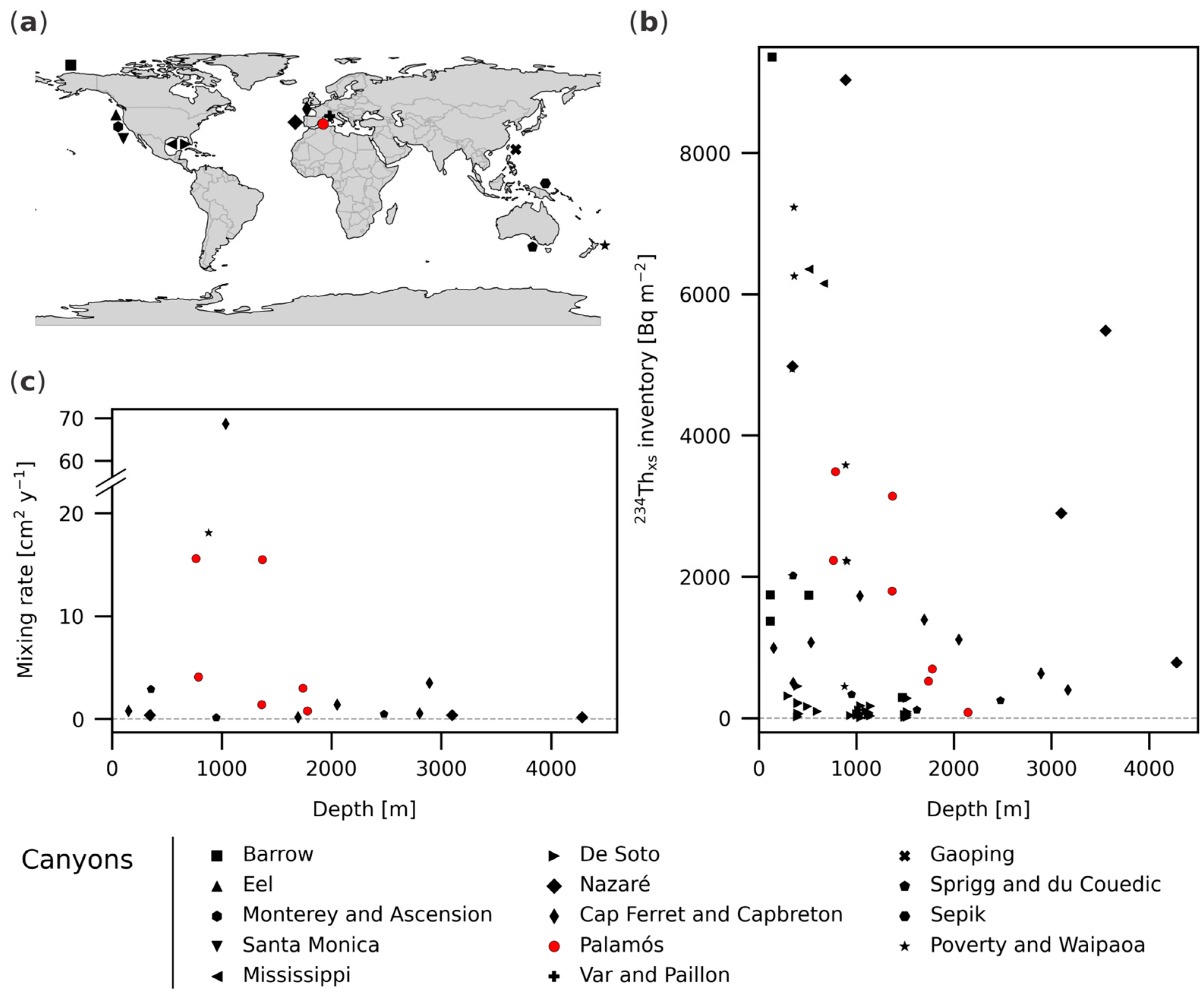 Figure 8. Overview of a global compilation of sedimentary 234Th data in canyons since 1979. (a) Location of canyons. (b) 234Thxs inventories [23,28,44,45,50,52,54,55,61] and (c) 234Thxs-derived mixing rates [28,44,45,58,61] reported from canyons. Note that the mixing rates y-axis in (c) has a scale break. The Palamós Canyon is highlighted in red. Compiled data set available under https://doi.org/10.1594/PANGAEA.987505 [39].