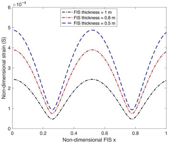 Figure 6 illustrates the strain along the FIS for different . The results confirm that thicker ice sheets are more rigid and are therefore better able to resist the applied wave–current load, resulting in less strain. Increasing the FIS thickness raises both the bending moment and the effective moment of inertia. In contrast, a thin FIS has much lower flexural rigidity and thus responds more readily to external loads. Its reduced rigidity allows wave and current loads to induce larger deflections and higher strain concentrations. These elevated strain levels make thin ice more vulnerable to mechanical failure, which magnifies tensile stresses at the ice surface, increasing the likelihood of crack initiation and propagation, leading to fracture or complete breakup when subjected to strong hydroelastic wave–current interactions.