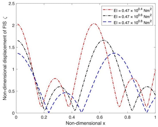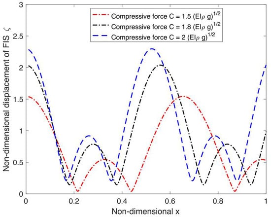 Figure 10 illustrates the variation of the non-dimensional displacement of the FIS along the non-dimensional length for various values of . It is evident that the magnitude and spatial pattern of the displacement are influenced by the applied compressive force. As increases, the amplitude of the displacement also increases. This trend suggests that higher compressive loads promote larger displacements of the FIS and that the compressive force has a destabilizing effect on the FIS.