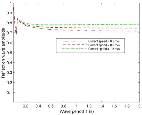 In Figure 11, the differences in reflection wave amplitude for lower values of wave period for various current speeds generate a resonant pattern. Observations indicate that the magnitude of the reflected wave increases with flow velocity, with this growth becoming substantial for longer wave periods. As the current speed increases, the wave–current interaction intensifies for longer wave periods, increasing the dynamic pressure at the FIS edge boundary.