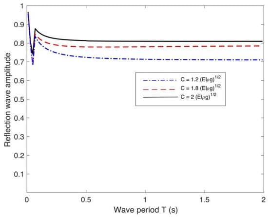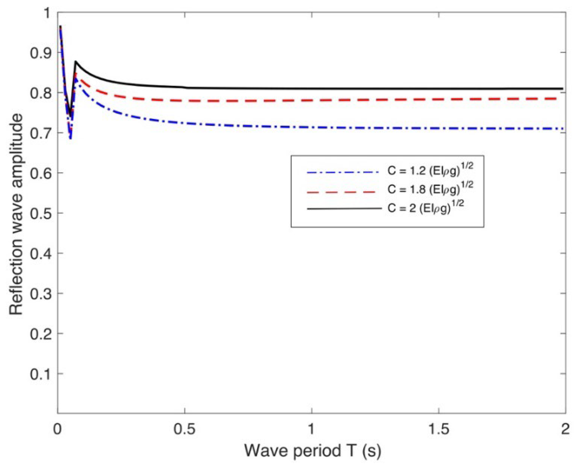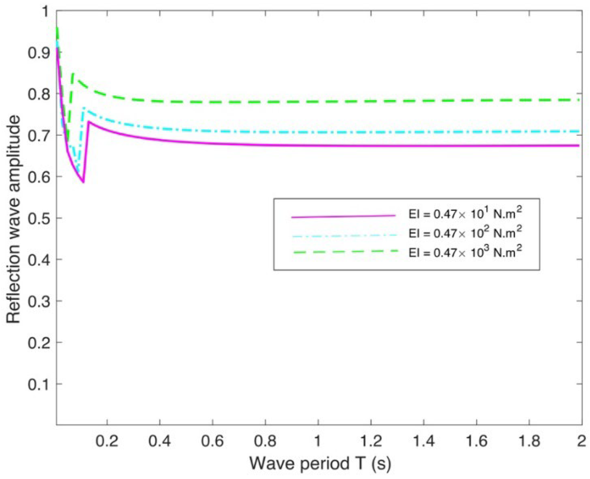Figure 12 elucidates the relationship between flexural rigidity () and wave reflection amplitude () as a function of wave period (), maintaining a constant current velocity of m/s. The data reveal that higher structural stiffness results in a more pronounced wave reflection. This observation stems from the fact that an increase in the structure’s rigidity renders the fluid-structure interface less compliant, consequently augmenting the reflection of incident waves by the now stiffer boundary. Furthermore, at shorter wave periods, the reflection amplitude consistently approaches unity ( ≈ 1.0) across the entire range of flexural rigidities, a result that is entirely consistent with physical principles.