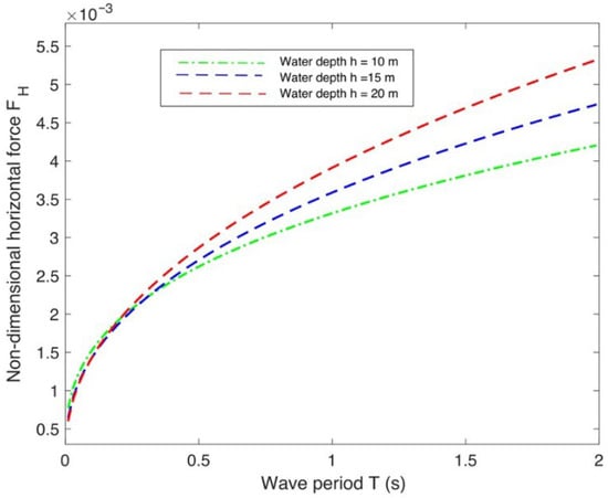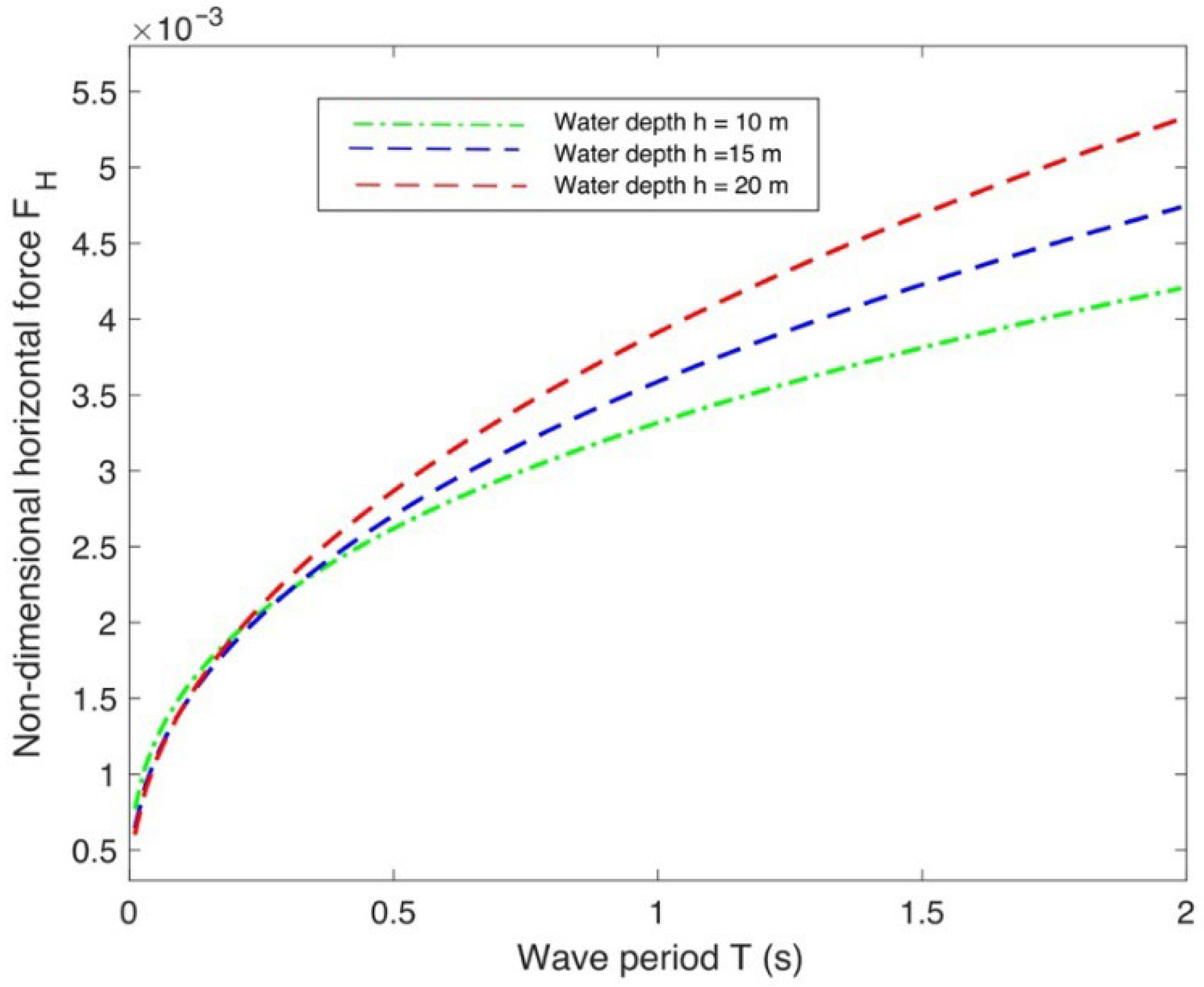 Figure 15 depicts the relationship between the and T for different h, considering the wave reflection by the vertical wall. It can be seen that the is higher for greater water depths and longer wave periods. This suggests that when the water depth is greater, especially in longer wave periods, effectively, the wave energy passes further below the FIS with less attenuation, resulting in a higher horizontal force on the vertical rigid wall.