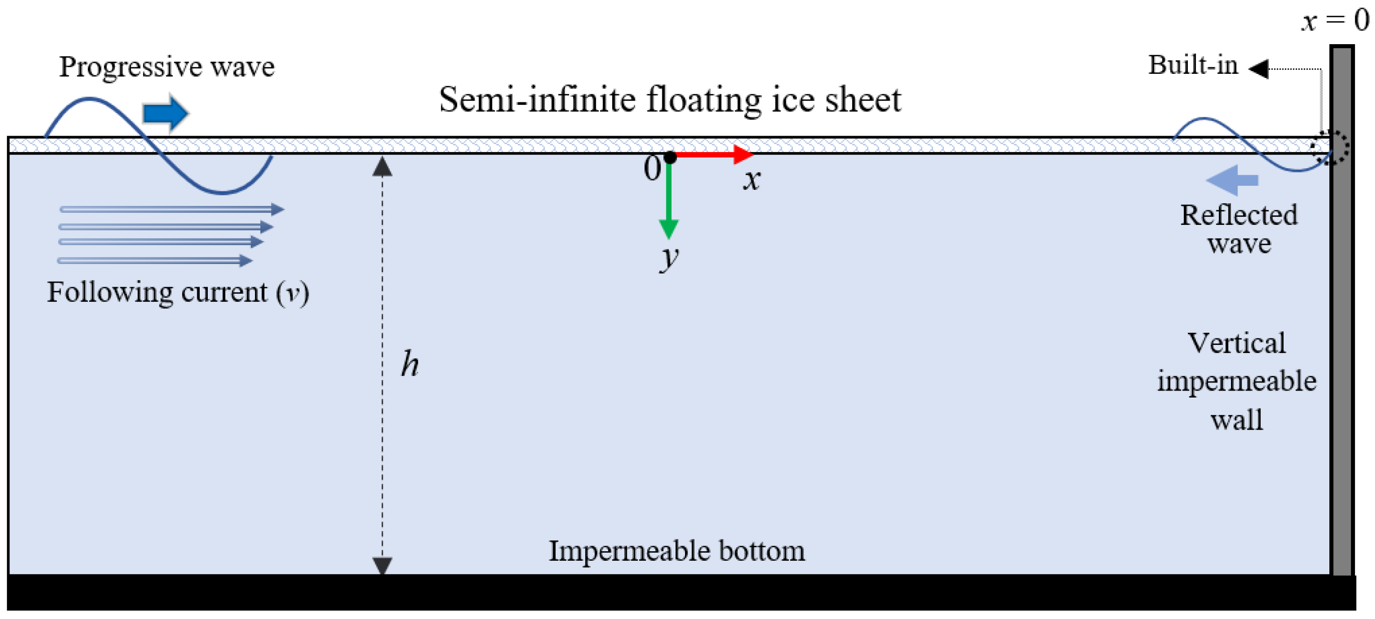 The massive sheets of ocean ice in the Arctic and Antarctic are used as important natural platforms. They are key for travel across the ice, for building short-term airstrips, and for aiding other transportation needs in these extreme marine environments [1,2,3,4]. On the other hand, when hydrodynamic forces—specifically combined swells and currents—impinge upon an ice-covered sea, the resulting wave propagation is fundamentally dictated by the structural stiffness inherent to the ice sheet surface [5]. The ice sheet possesses a significantly large horizontal dimension, allowing it to be approximated as infinite for many practical cases. Due to the continuous excitation of a small-amplitude wave–current, the overall performance characteristics of the component are overwhelmingly driven by recoverable deformation.