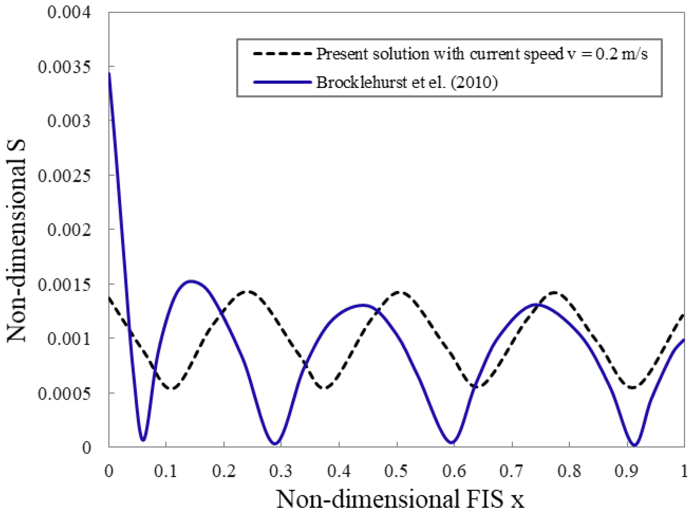 Figure 2 illustrates a comparison of the non-dimensional strain () along the non-dimensional length () of the FIS between the present solution under current loading and the results of [44]. For this comparison, the physical parameters are the same as in [44]. Overall, the two curves exhibit a qualitatively similar oscillatory pattern. However, the inclusion of current in the present model leads to noticeable changes in the phase of the strain response. Specifically, the present solution shows slightly reduced strain amplitudes and a phase shift relative to the no-current case in [44], indicating that the presence of current alters the hydrodynamic pressure distribution and modifies the FIS deformation characteristics.