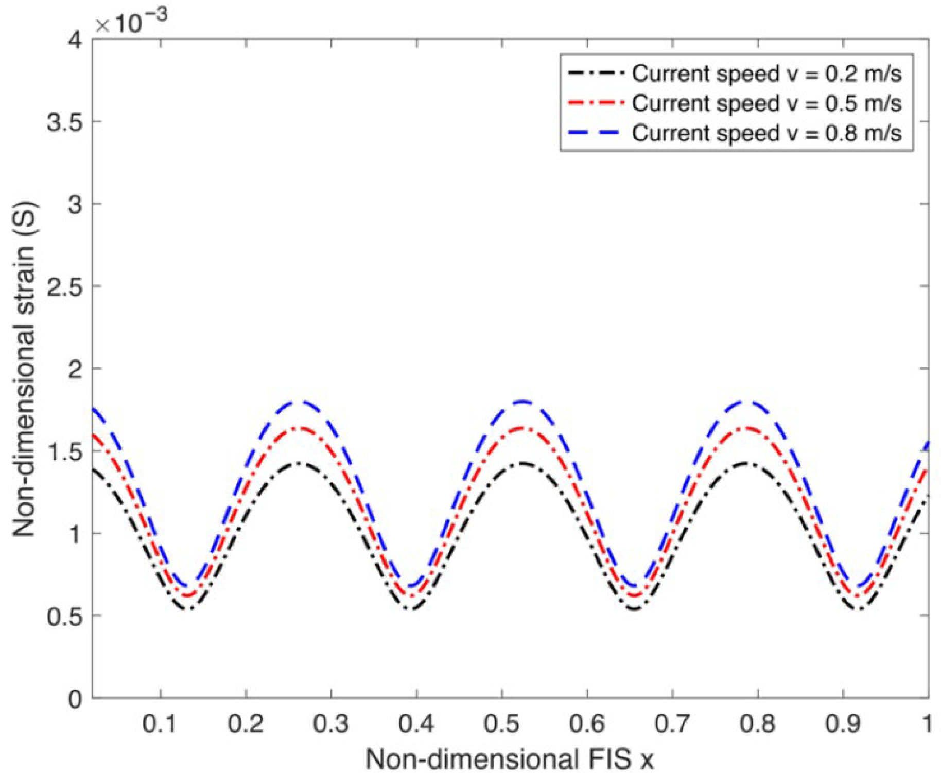 Figure 3 effectively demonstrates that in the present model, increasing the current speed significantly increases the magnitude of strain (S) over the length (x) of the FIS. This critical observation is primarily due to the exponential increase in the fluid excitation force imparted by the flow onto the FIS, highlighting the crucial role of current as a dominant and indispensable environmental parameter for accurately predicting the hydroelastic response of the FIS. This necessity is vital for applications such as assessing ice sheet stability and predicting ice-induced loading on coastal or offshore structures.