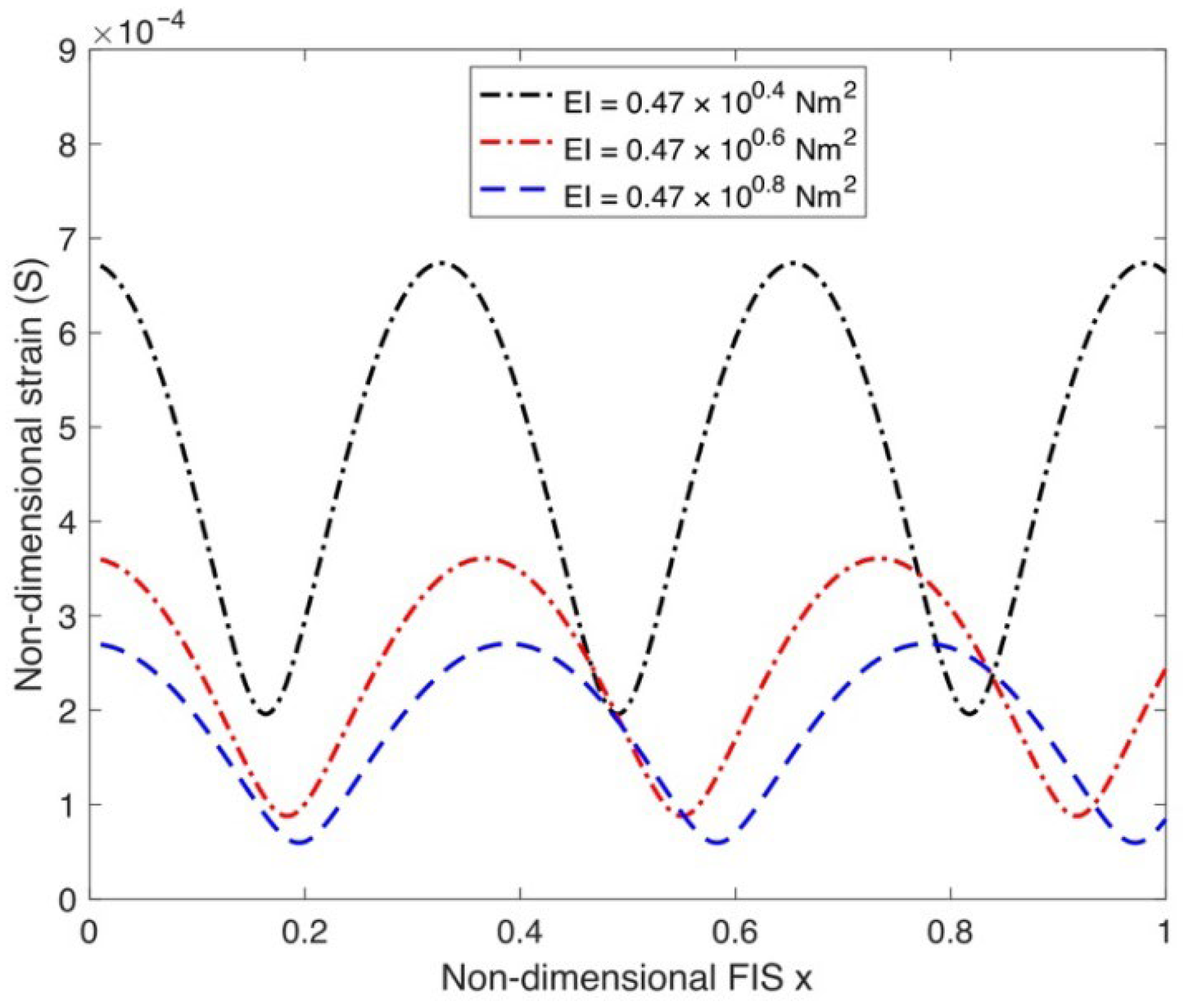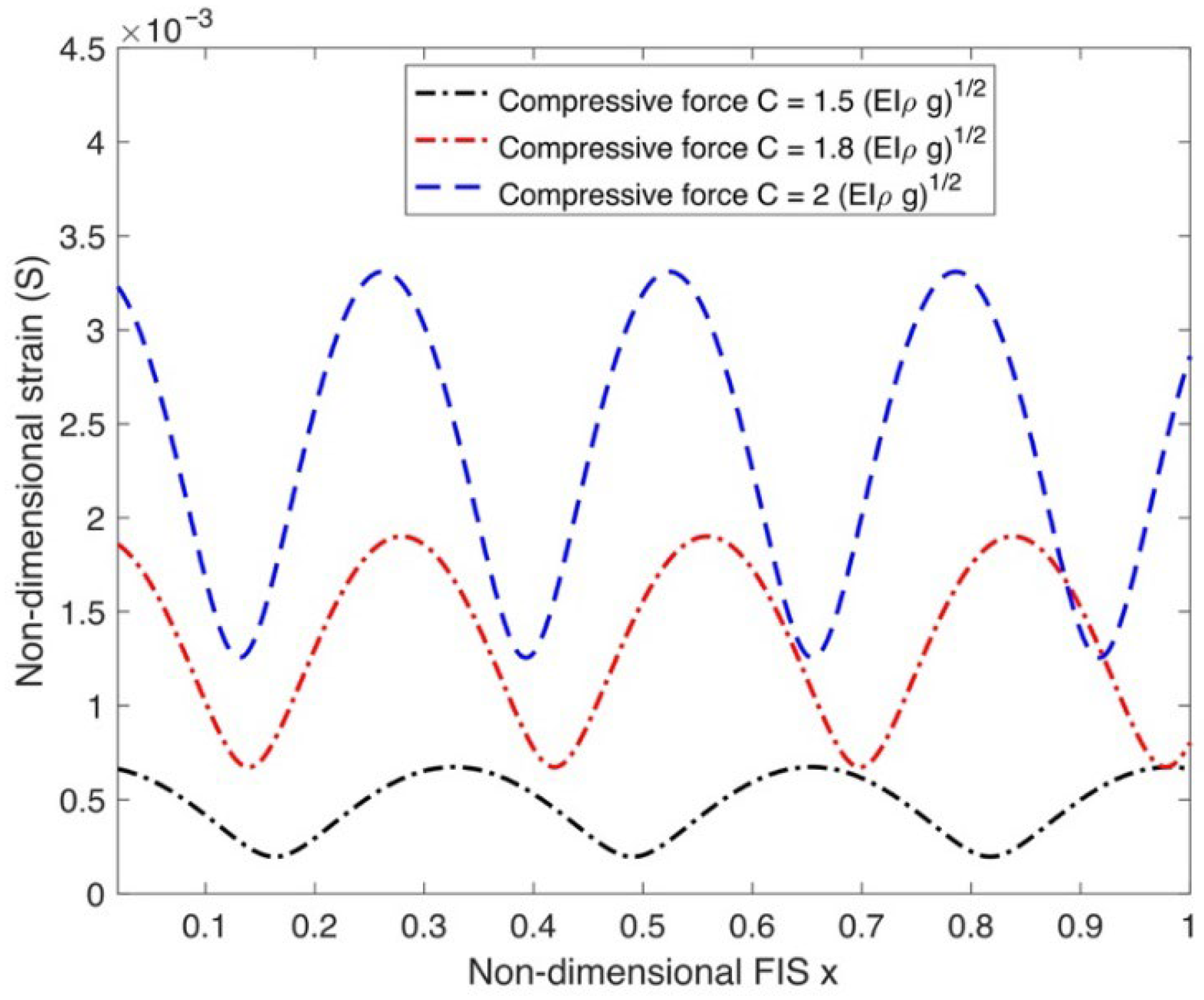 Figure 4 plots how the non-dimensional strain of the FIS changes over its non-dimensional length for different compressive forces (). Increasing the magnitude of the compressive force leads to a significant amplification of the dynamic strain amplitude experienced by the FIS. The compressive force effectively reduces the flexural rigidity of the FIS, making it more susceptible to dynamic excitation loads like waves and currents.