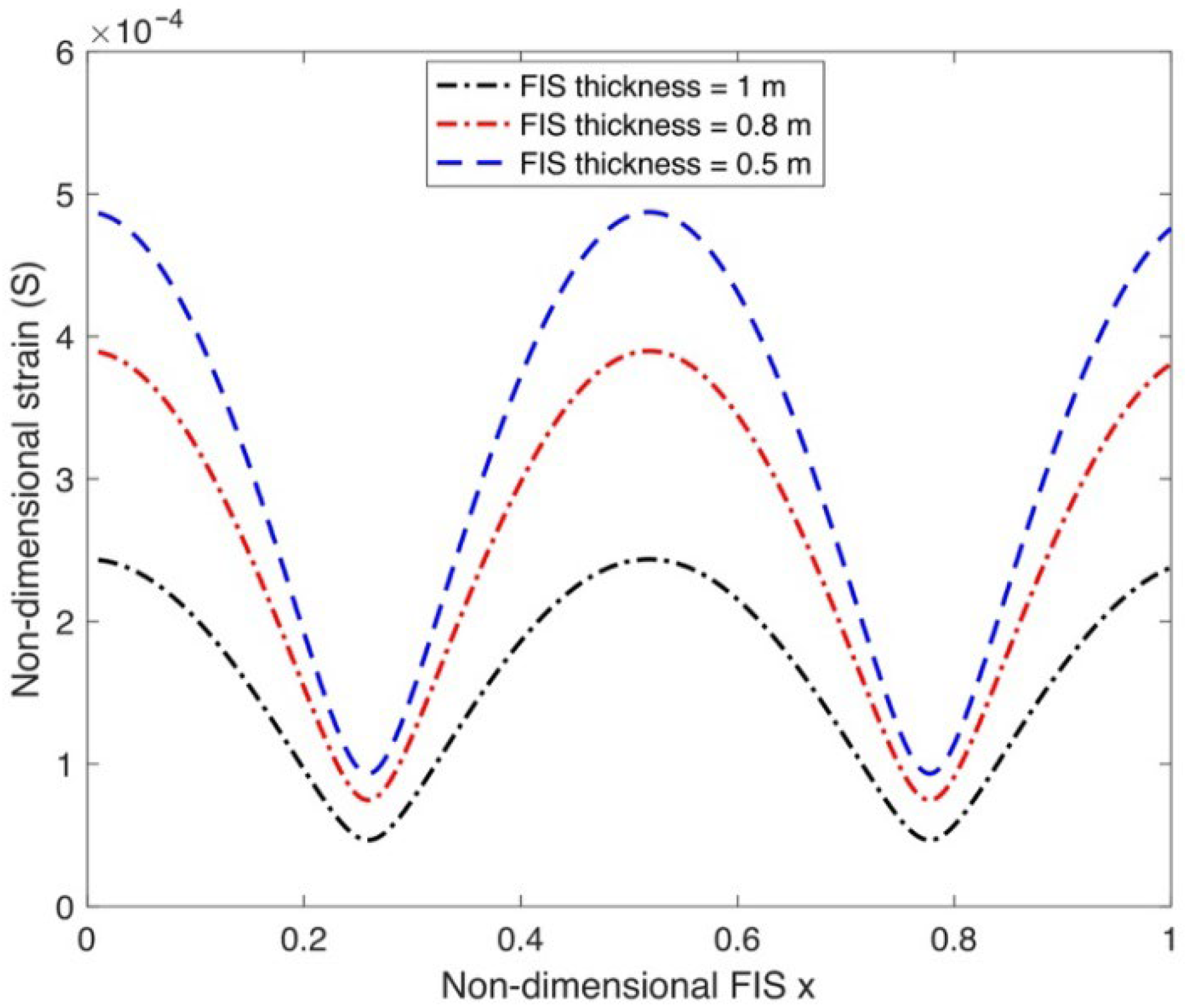 Figure 5 illustrates an inverse relationship between the non-dimensional strain and the flexural rigidity of the FIS. For the given non-dimensional length, an increase in the results in a substantial decrease in the measured strain.. Essentially, the ice sheet’s higher flexural rigidity successfully mitigates the development of large non-dimensional strains along its length, thereby enhancing the integrity of the FIS.