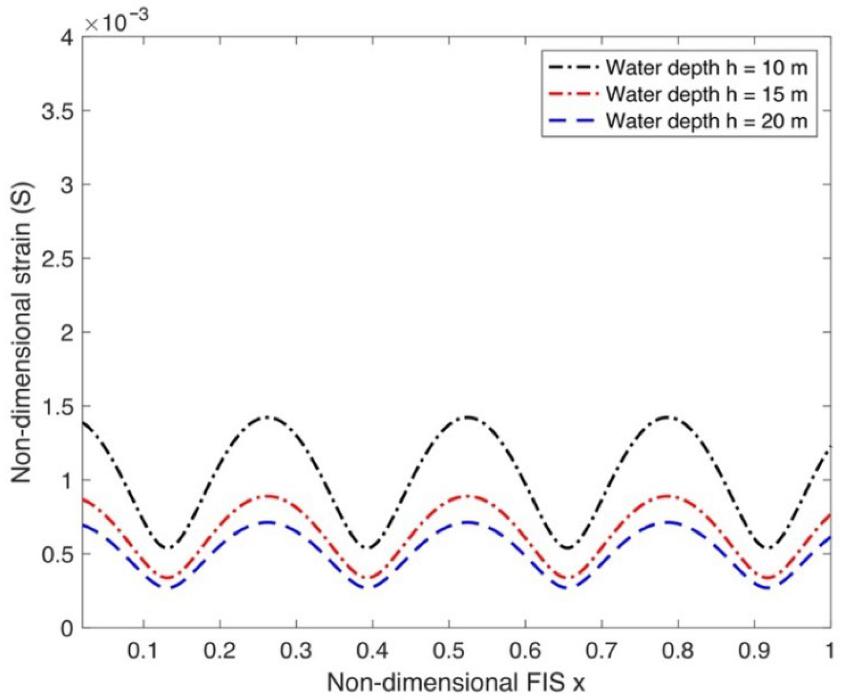 From Figure 7, observations demonstrate that for deeper water, the amplitude of the non-dimensional strain decreases. Specifically, the highest strain values occur for the shallowest case (), while the lowest correspond to the deepest case (). As in shallower water, the velocity field beneath the FIS is constrained by the seabed, significantly increasing the hydrodynamic pressure and leading to a stronger interaction between the wave–current and the FIS.