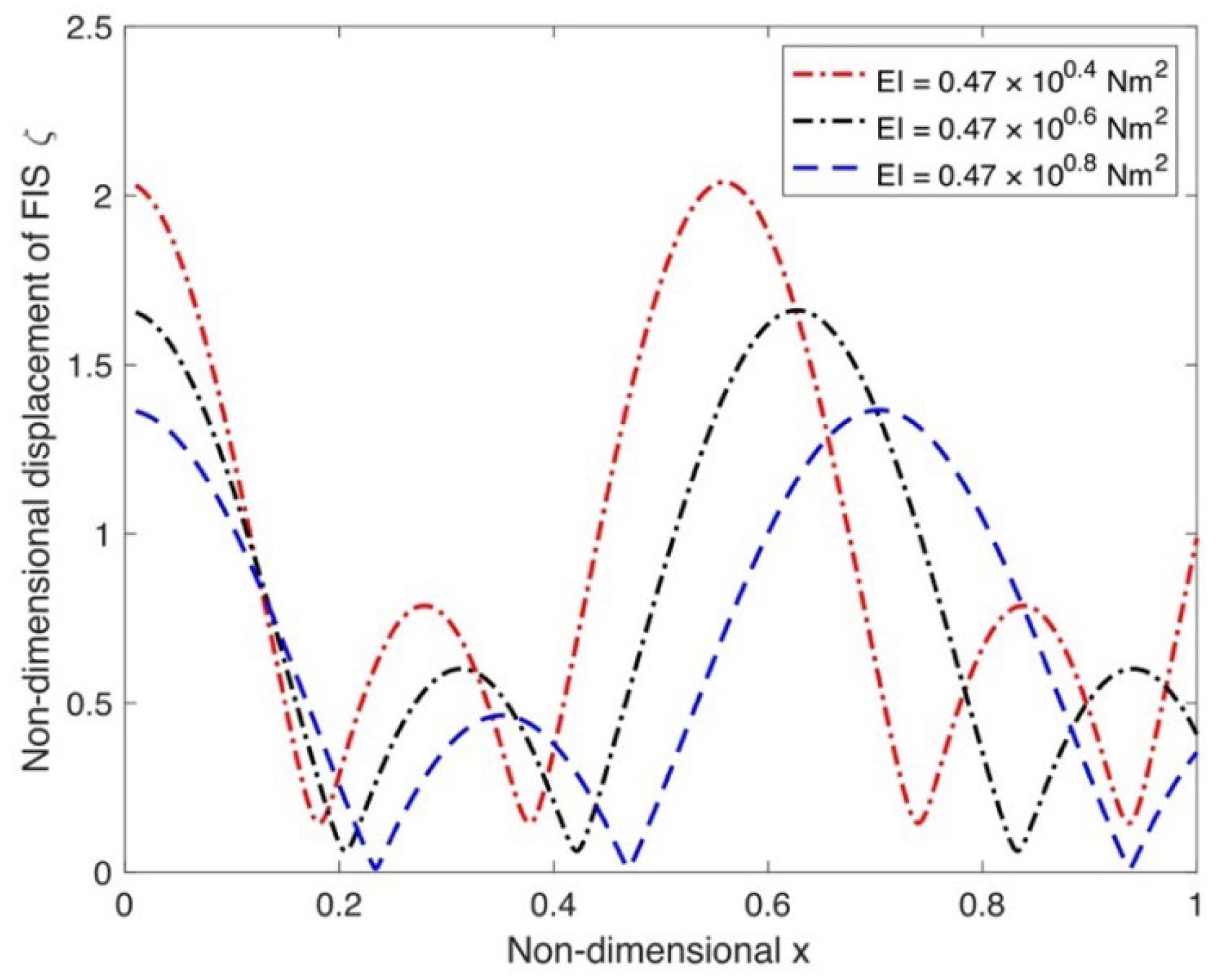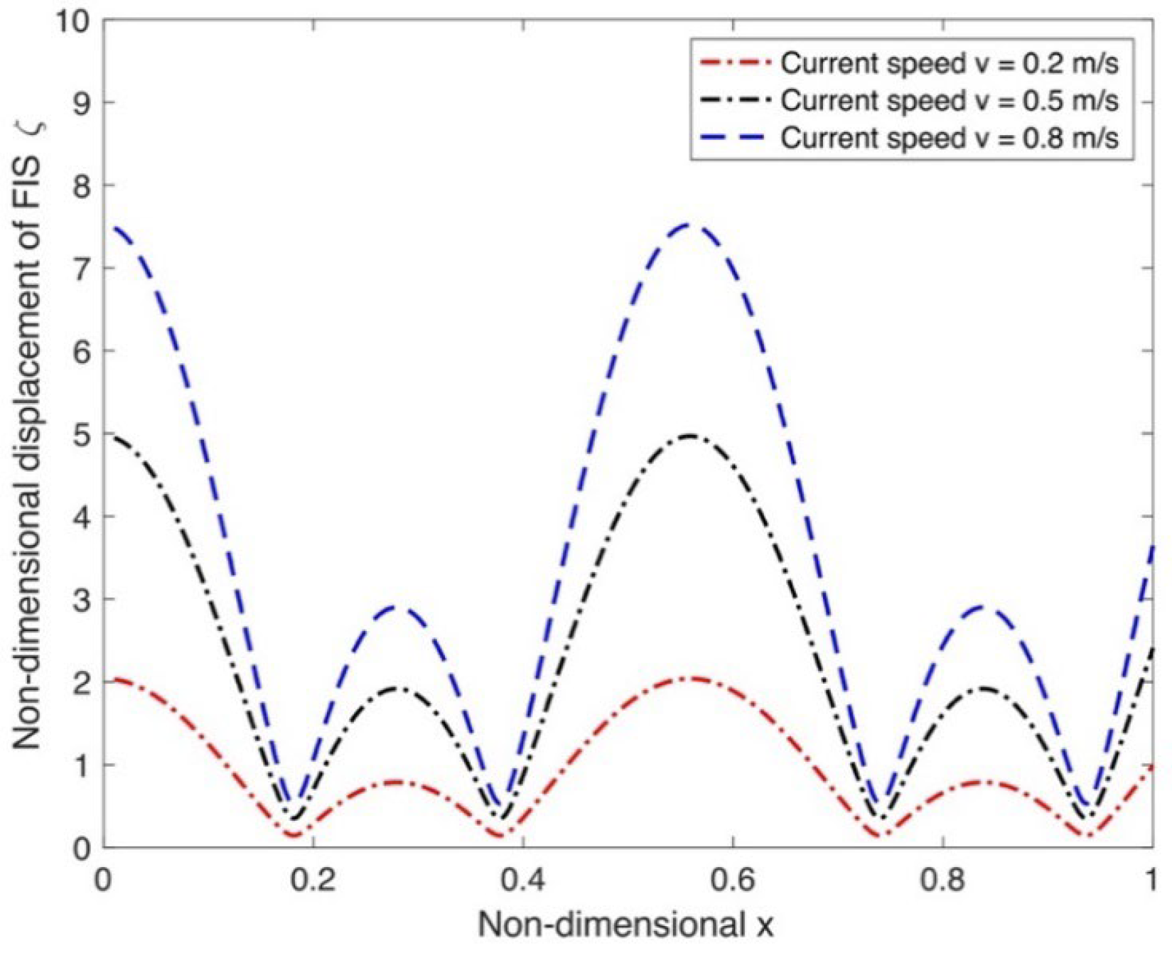 Figure 8 shows the impact of current speed on the FIS displacements against non-dimensional length and using the designated values for each parameter, as enumerated in Table 1. As the current speed increases, the magnitude of the non-dimensional displacement along the non-dimensional length of the FIS increases significantly. Higher current speed intensifies the hydrodynamic excitation acting on the FIS, thereby amplifying its hydroelastic response. This behavior highlights the sensitivity of the FIS to current-induced loading and demonstrates that the current plays a dominant and indeed indispensable role. Accurately capturing its influence is therefore essential for precise prediction and reliable assessment of the overall hydroelastic performance.