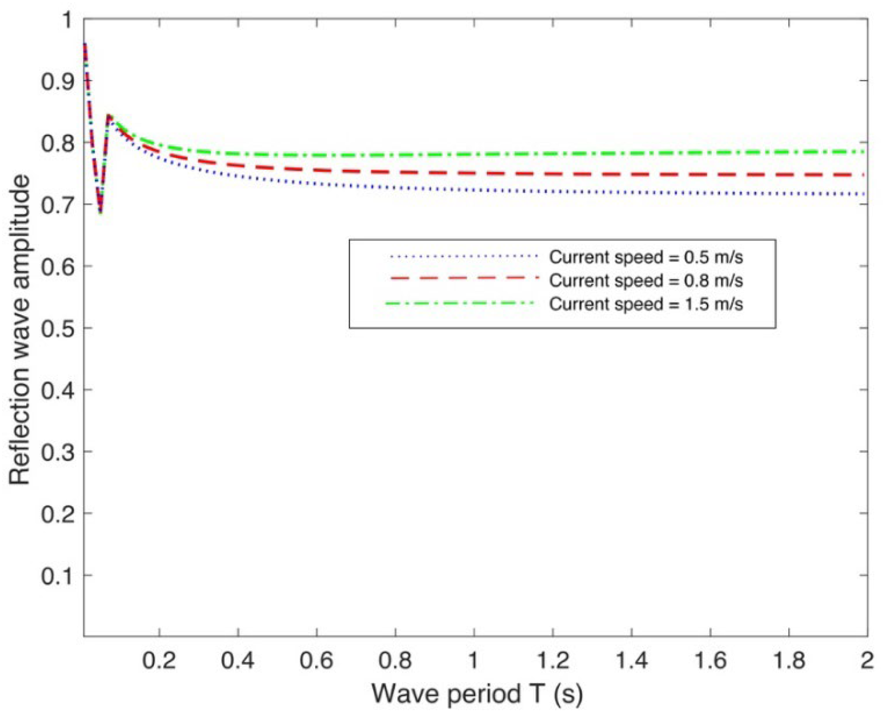 Here, the infinite series sums (11) associated with the reflection amplitude is bounded such that it incorporates a maximum of elements to determine the coefficients ‘’ and ‘’. An analysis of reflection wave amplitudes () in Table 2, considering increasing and different current speed values, confirms their computational accuracy. Table 2 shows that the values are accurate to three decimal places for . Consequently, to maintain computational accuracy.