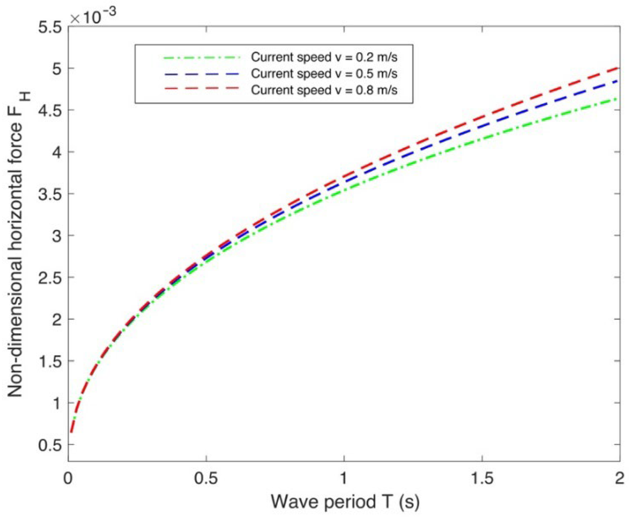Figure 14 illustrates the variation of the over a range of T for different v affected by a wall. The results show a clear increasing trend of the horizontal force with increasing current speed for the longer wave periods. This trend is consistent with theoretical expectations since longer wave periods are typically associated with higher wave energy, and the combined effects of increasing wave period and higher current speed result in an amplification of the hydrodynamic load on the FIS.
