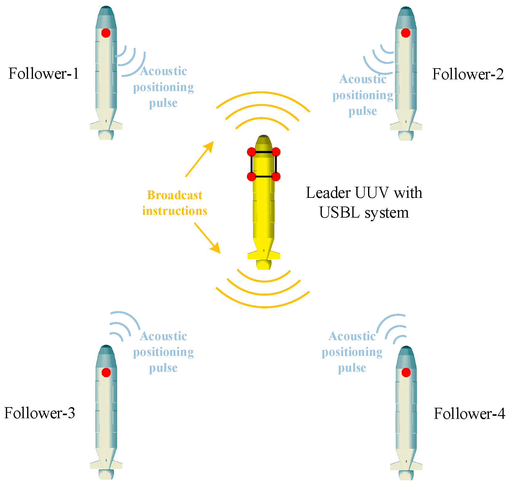 Figure 1. The system utilizes a hybrid measurement-communication method. The leader UUV serves as the communication hub, equipped with an ultra-short baseline (USBL) positioning sonar array, while the followers are equipped with responders. The leader UUV periodically transmits acoustic pulses, which are received and responded to by the responders on the follower UUVs. These response pulses are then utilized by the leader to determine the relative positions of all follower UUVs [