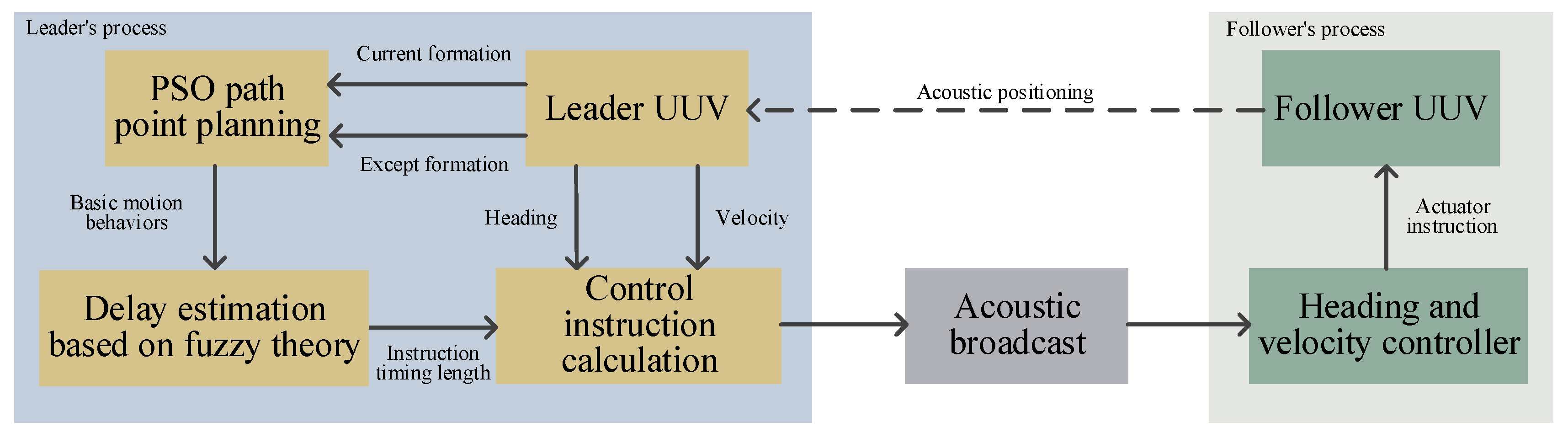 Figure 4. Before the initiation of the formation reconfiguration, the leader UUV employs the PSO method to optimize the basic motion sequences for all followers. The leader UUV then broadcasts the optimization results to the follower UUVs. Based on the received motion sequences, each follower generates its respective control and guidance commands. Formation reconfiguration is initiated at the same time for all UUVs to minimize the impact of communication delays on the formation system.