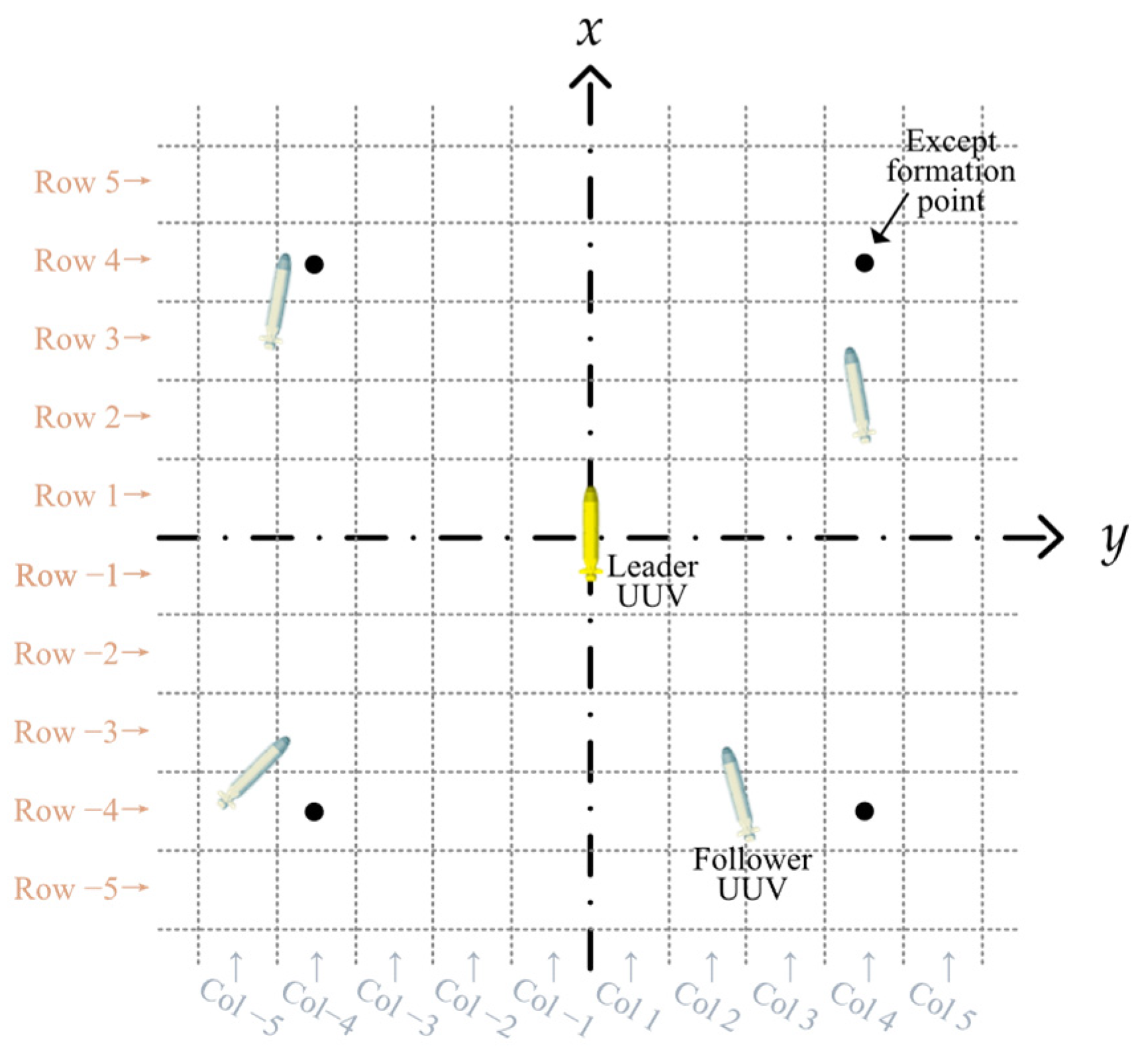 Row motion: motion parallel to the x-axis within the same column region, which changes only the row coordinate of the follower UUV.