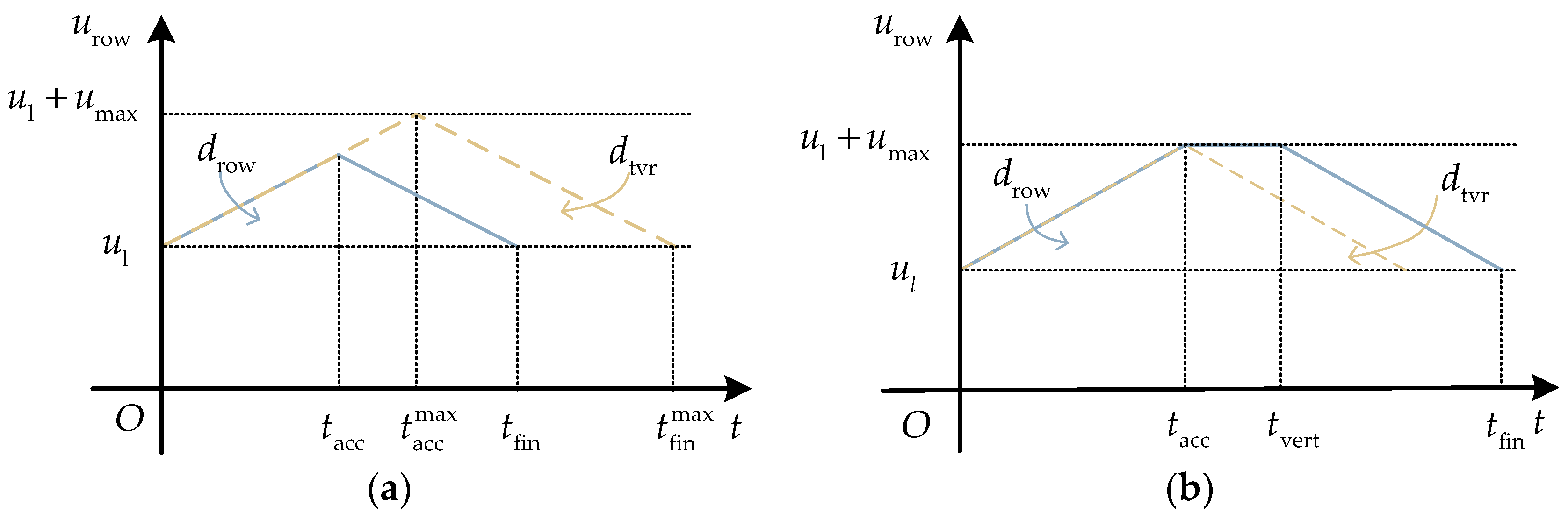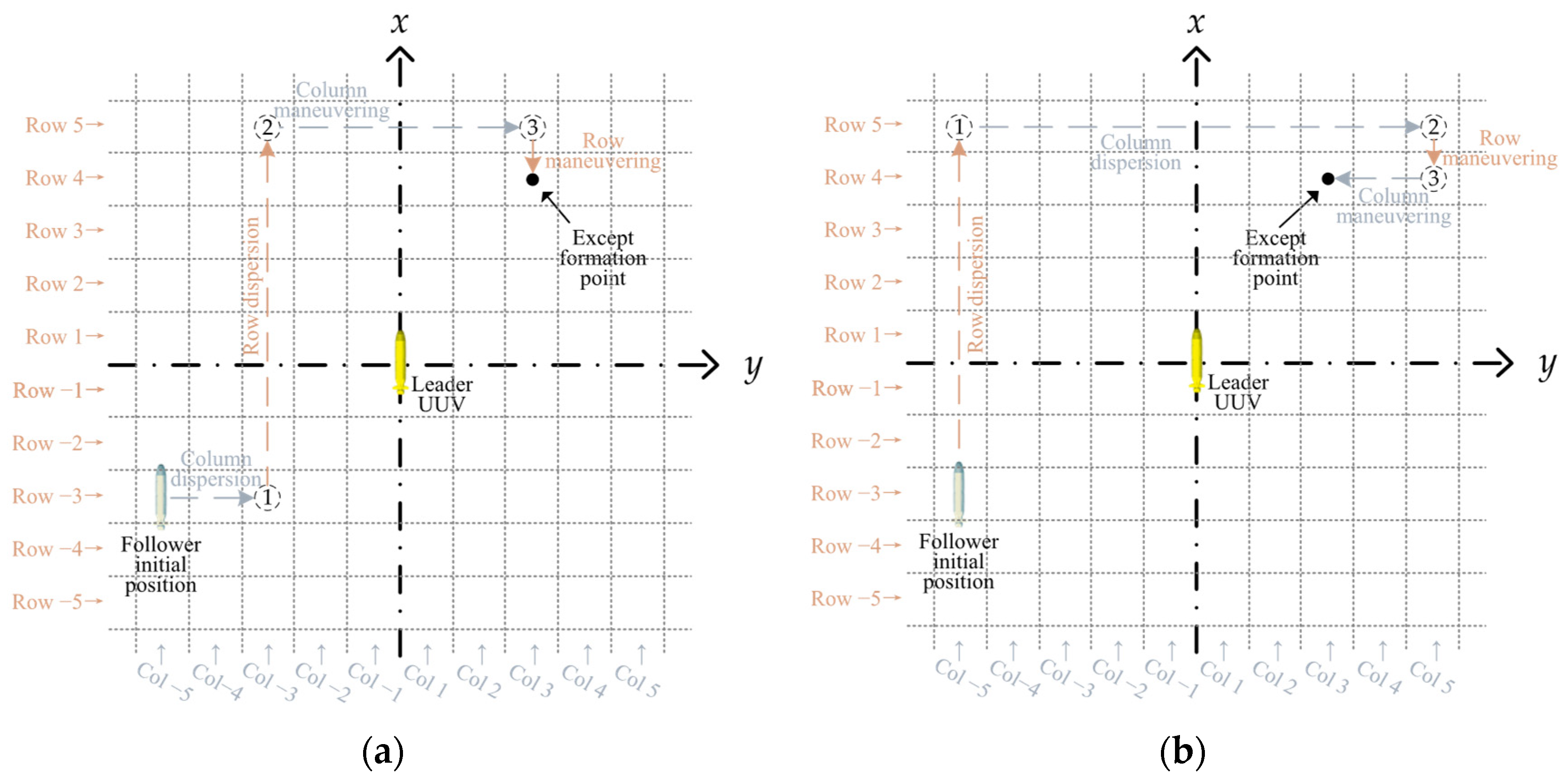 Figure 6a, when a follower UUV moves from its initial position to the desired target point, the motion sequence can be divided into column dispersion, row dispersion, column maneuvering, and row maneuvering. Two types of motion sequences are equivalent. It is worth noting that the first type of motion sequence is preferred in this article (column dispersion, row dispersion, column maneuvering, row maneuvering).