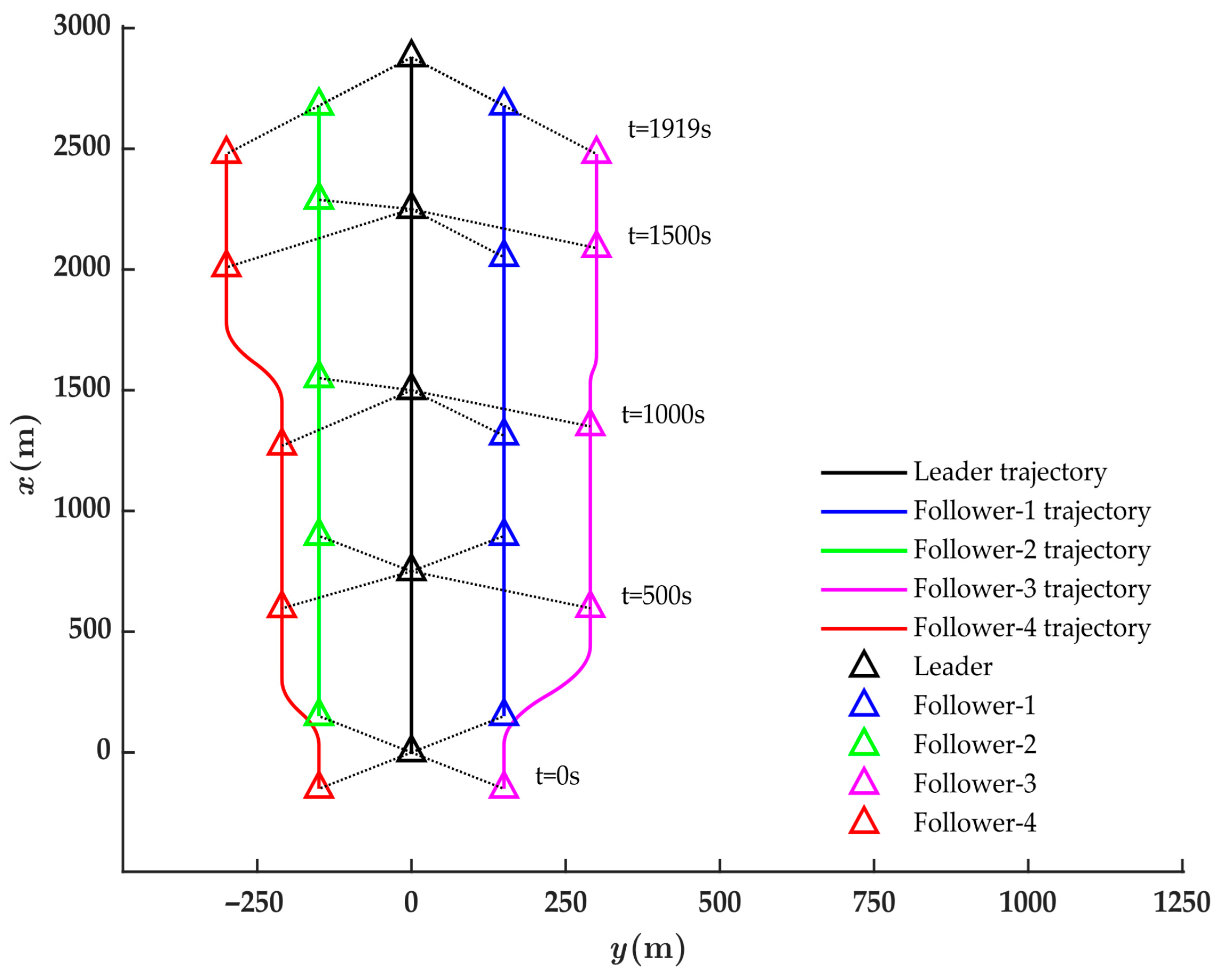 t = 0 s), the follower UUVs were distributed around the leader UUV, forming a rectangular formation. At this time, the leader UUV assigned initial positions and planned the target points for formation reconfiguration for each follower. Navigation and velocity control commands were periodically transmitted to the followers via simulated underwater acoustic communication. After 1912.5 s, the formation reconfiguration was completed, transforming the initial rectangular formation into the desired triangular formation.
