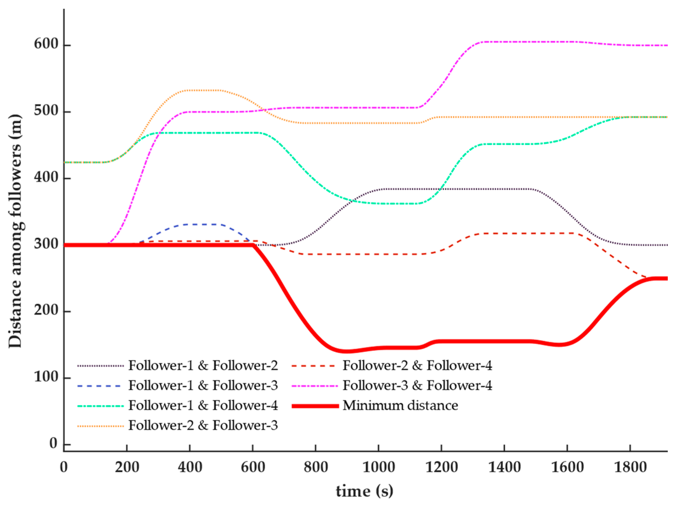 Figure 15. The simulation results indicate that the distances between the individual UUVs within the multi-UUV system consistently remained within a safe range, with no risk of collision observed. Based on the data presented in