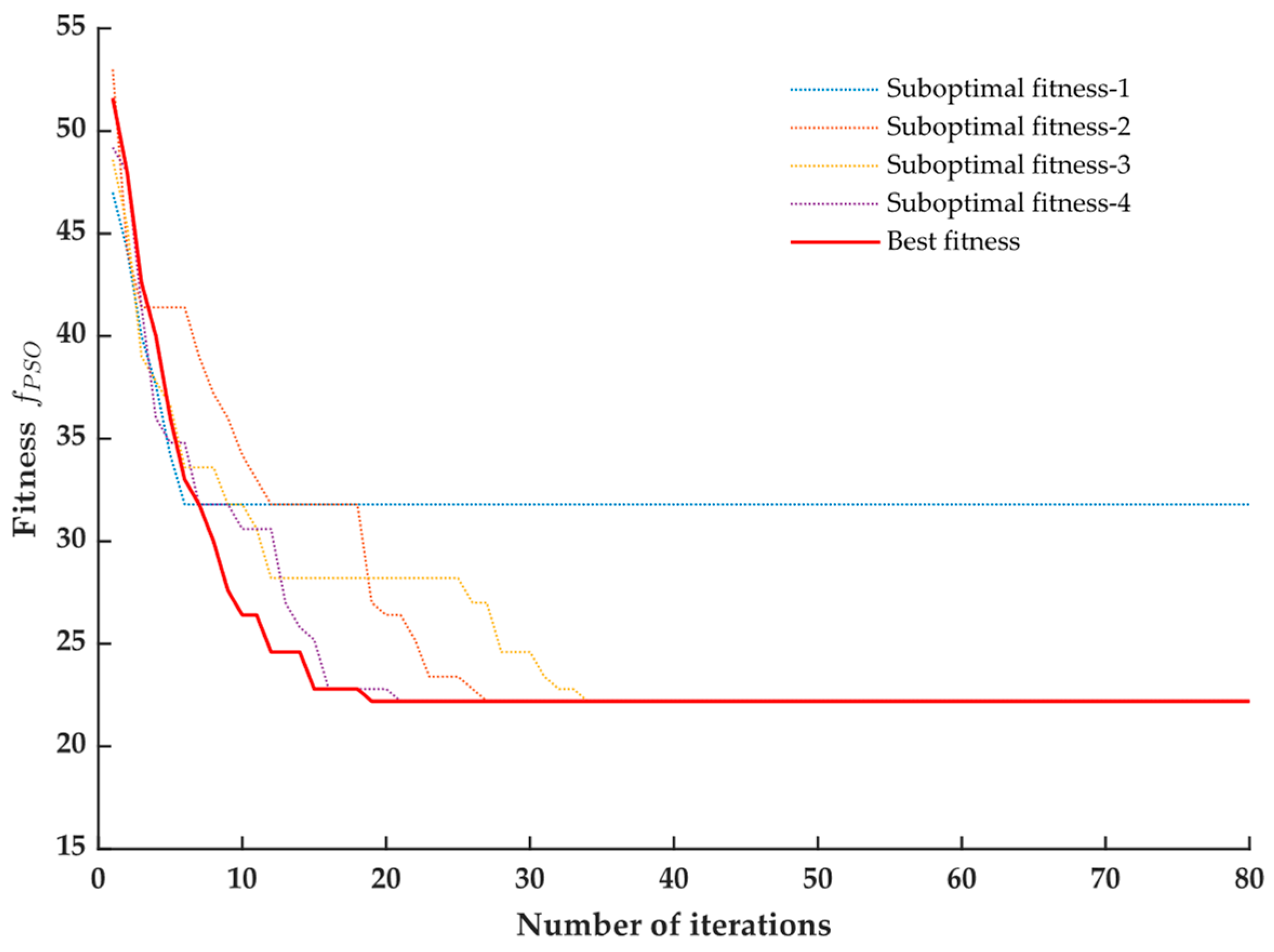 For the PSO algorithm, the dimensionality of particles was set to 2, the number of particles in the swarm . The learning factors , and the maximum and minimum inertia weights . The fitness function weighting coefficient . The optimal position iteration count , and the maximum number of iterations .
