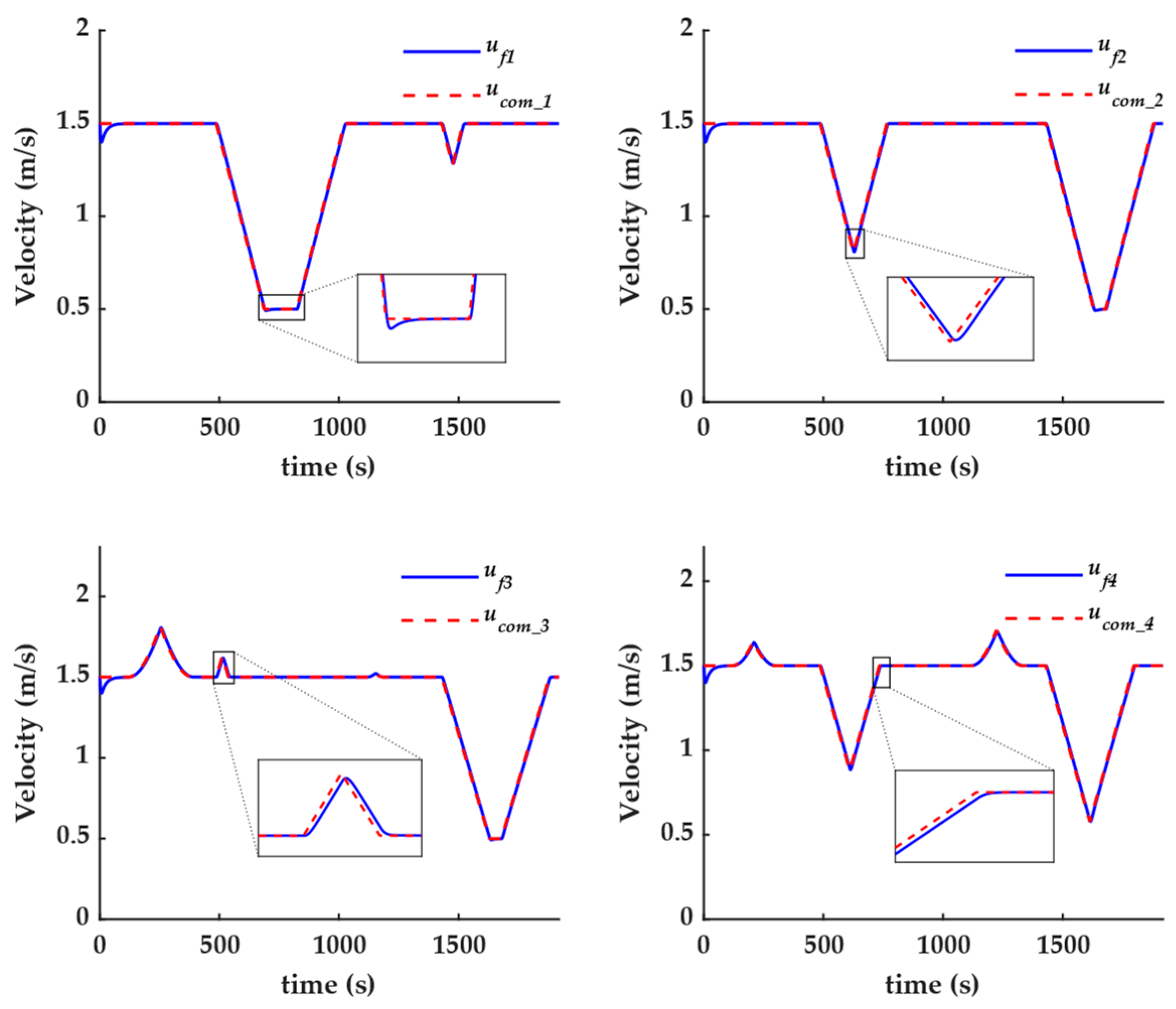 Figure 19 confirm that the speed and heading control commands received by the follower UUVs were continuous over time, with no loss of control commands observed. These results indirectly demonstrate the feasibility of the proposed delay compensation method.