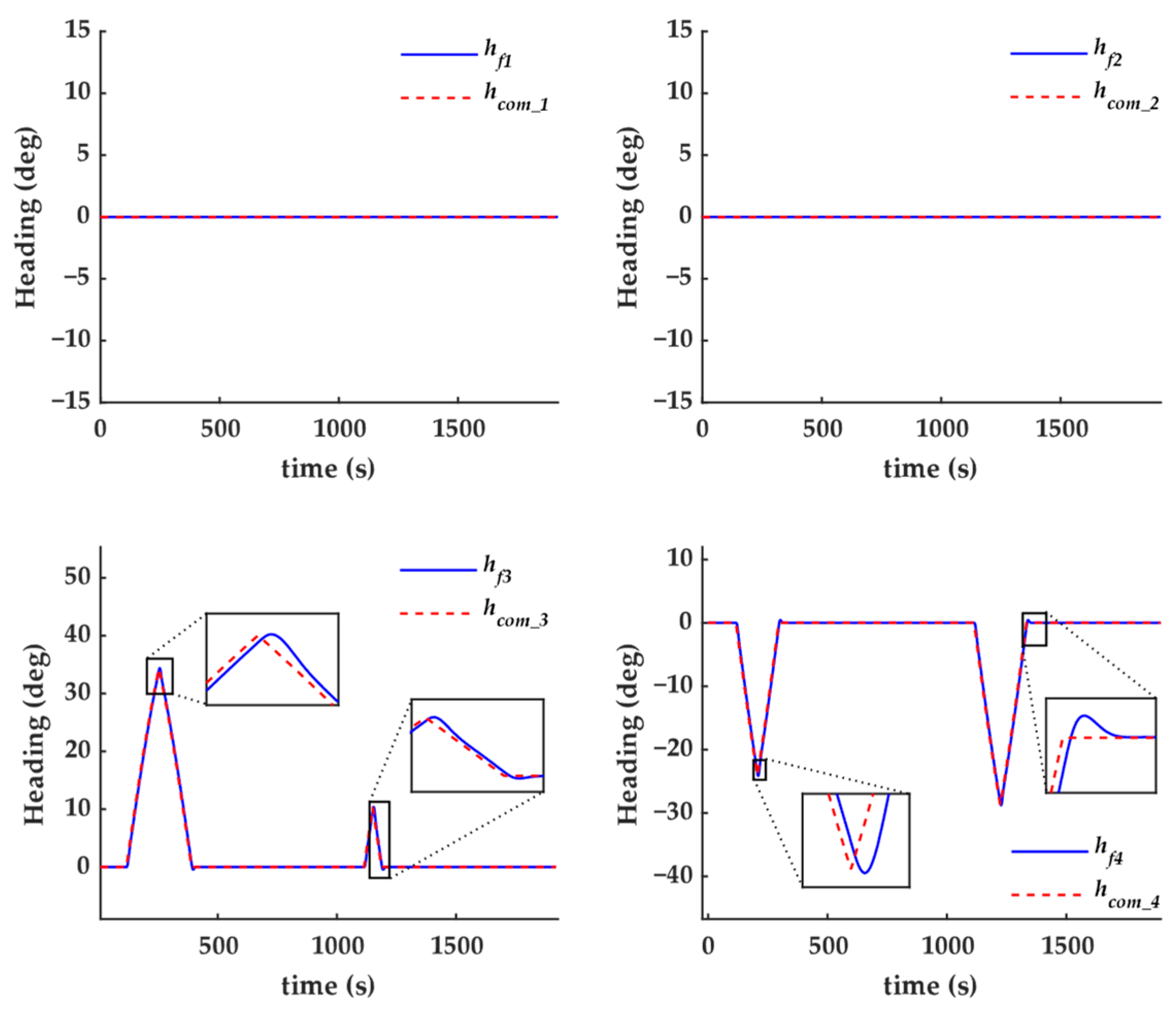 Figure 19, it can be observed that the heading control commands for followers 1 and 2 remained constant at 0°, indicating that these two UUVs performed linear motions only during the reconstruction process. This reflects the effectiveness of the proposed target position allocation method. Furthermore,