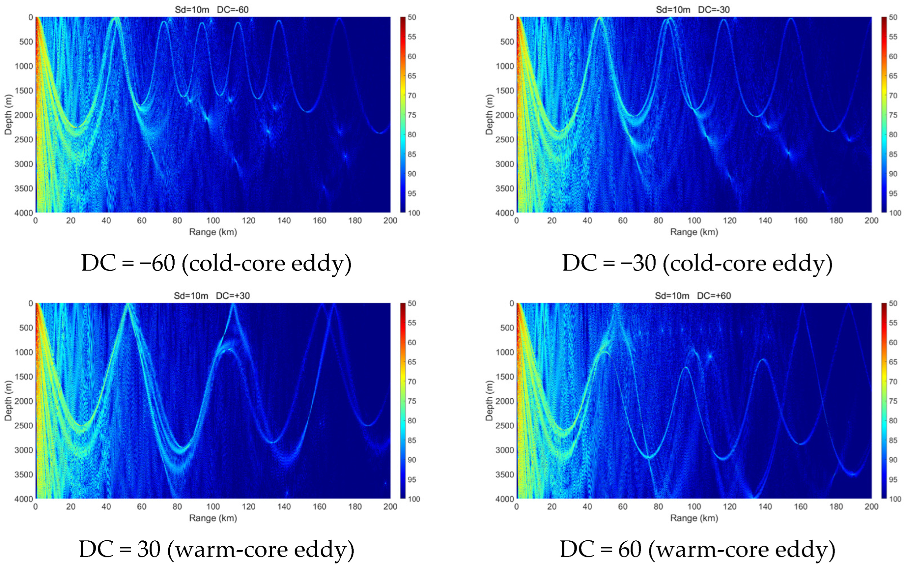 - Mesoscale eddies alter the vertical sound speed distribution, and such alterations—particularly when modifying sound channel properties such as the surface channel or the deep sound channel—can lead to significant changes in acoustic propagation behavior. Warm-core and cold-core eddies exhibit distinctly different propagation mechanisms.