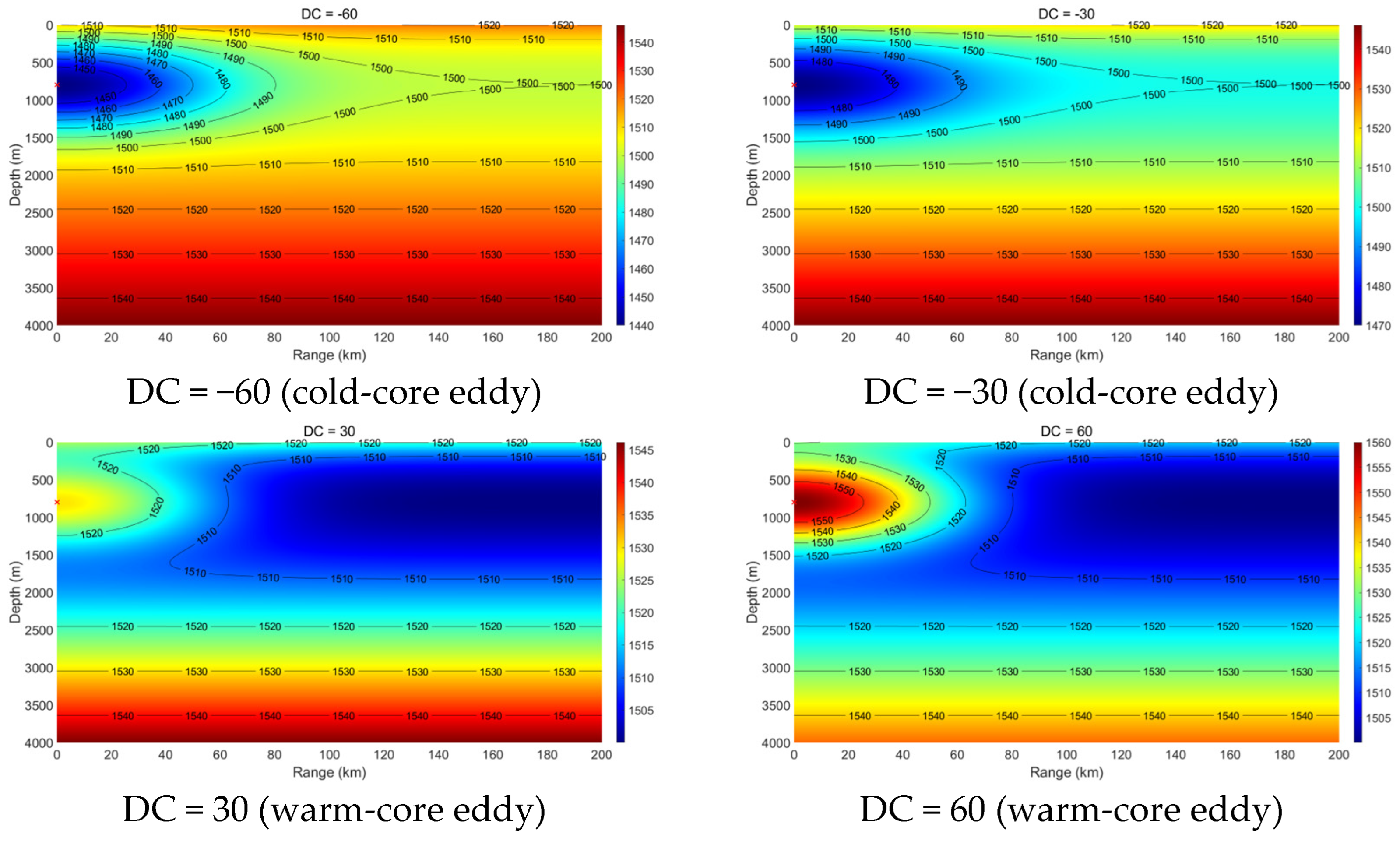 - Zhu, F.Q.; Zhang, H.G.; Qu, K. Influence of mesoscale warm eddy on acoustic propagation in the northeastern South China Sea. J. Harbin Eng. Univ. 2021, 42, 1496–1502. [Google Scholar]